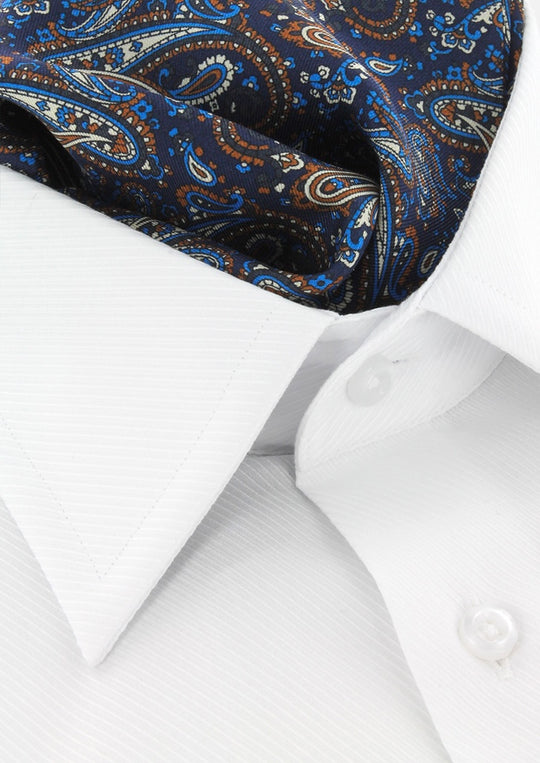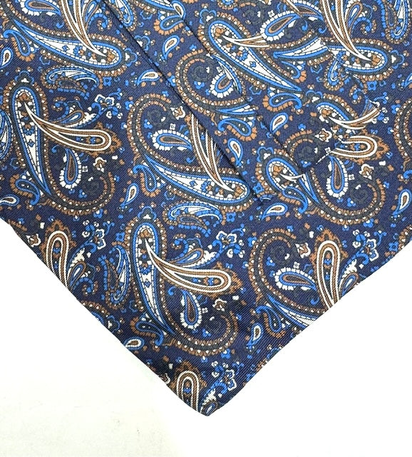 Ascot homme 100 % soie de couleur bleu et marron à motifs paisley. Cet ascot de la marque Cotton Park est d'une largeur de 16 cm et d'une longueur de 136 cm.