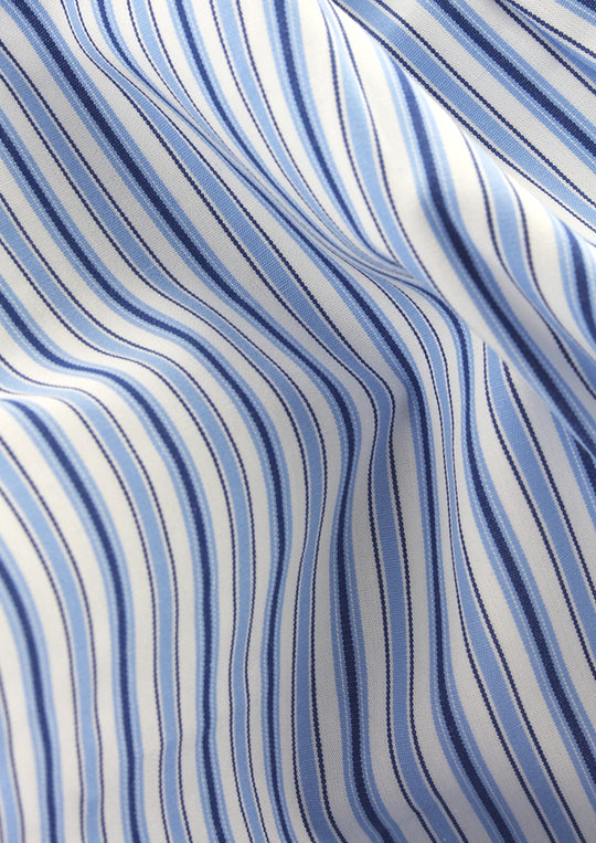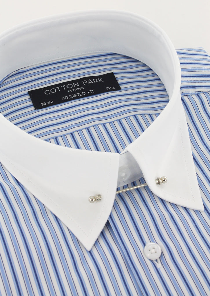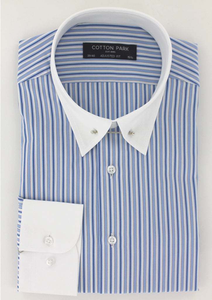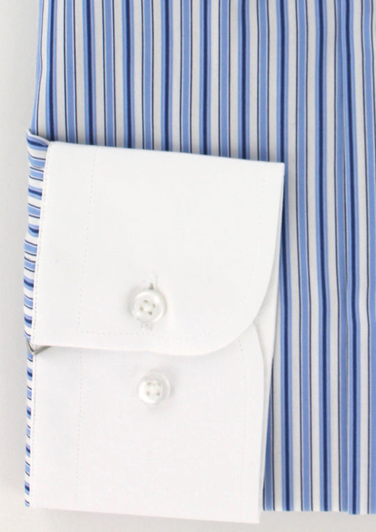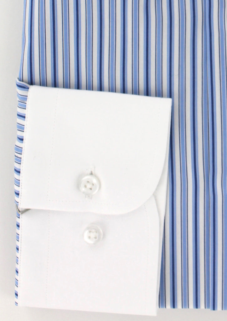 Men's fitted shirt with sky blue stripes made with a tab collar in silver color. Its long sleeves with adjustable button cuffs make it possible to adapt precisely to the width of the wrists. The English collar keeps the tie in good condition throughout the day.
