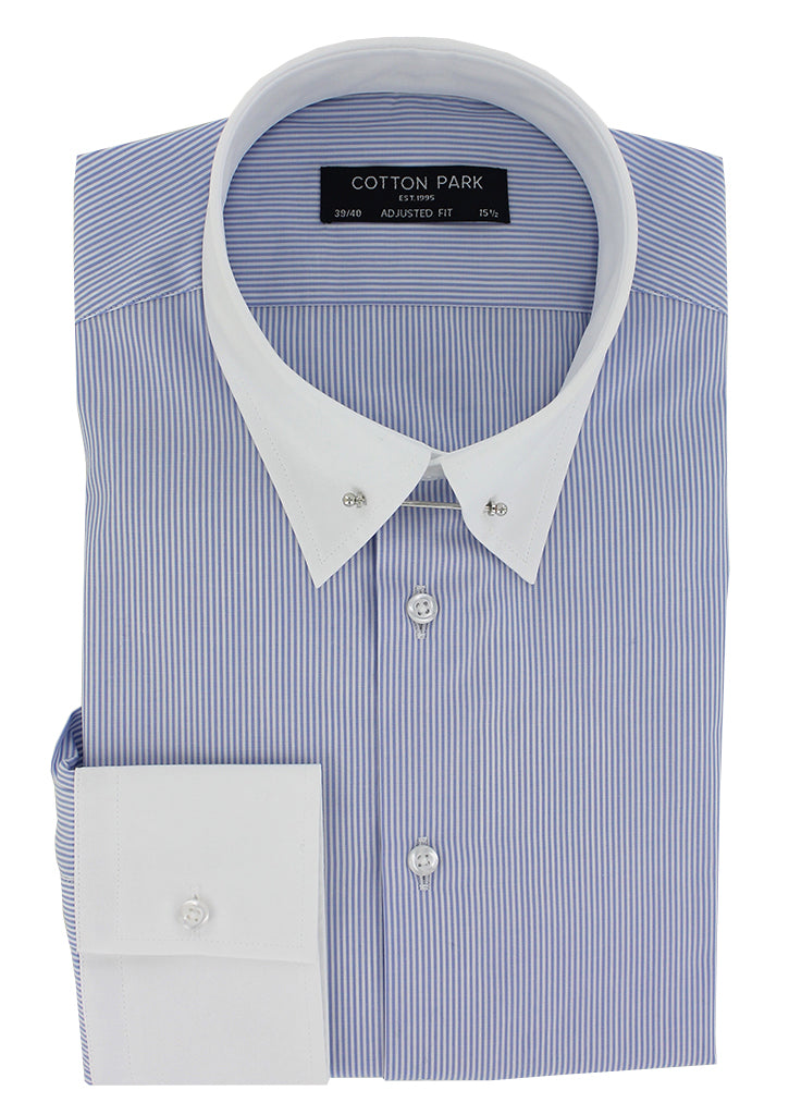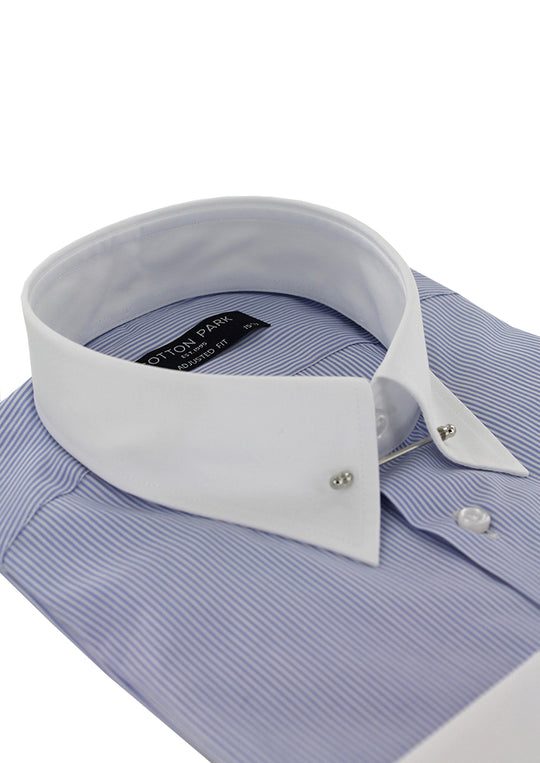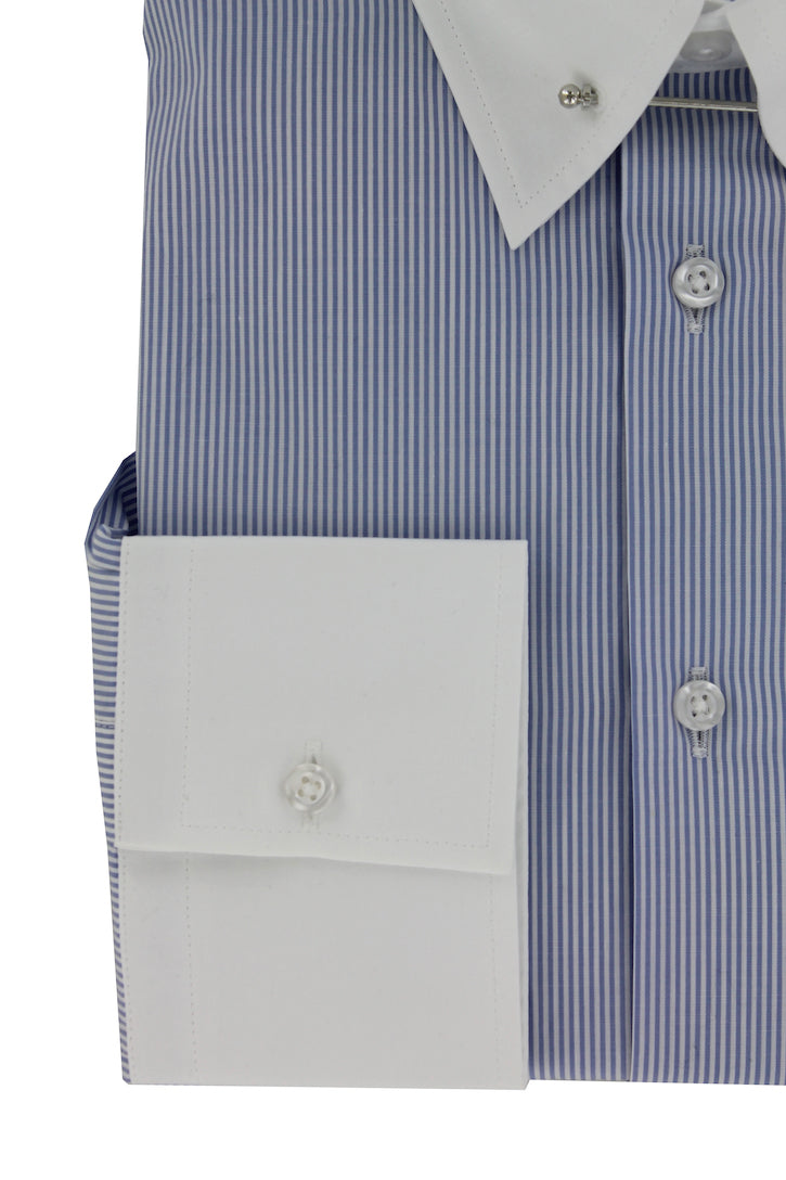 Men's fitted cut shirt with blue stripes featuring an English collar with a silver color bar. In a jiffy, it is possible to turn this simple wrist into a French cuff and thus wear a nice pair of Cotton Park cufflinks. The English collar will keep your tie in good shape all day long.