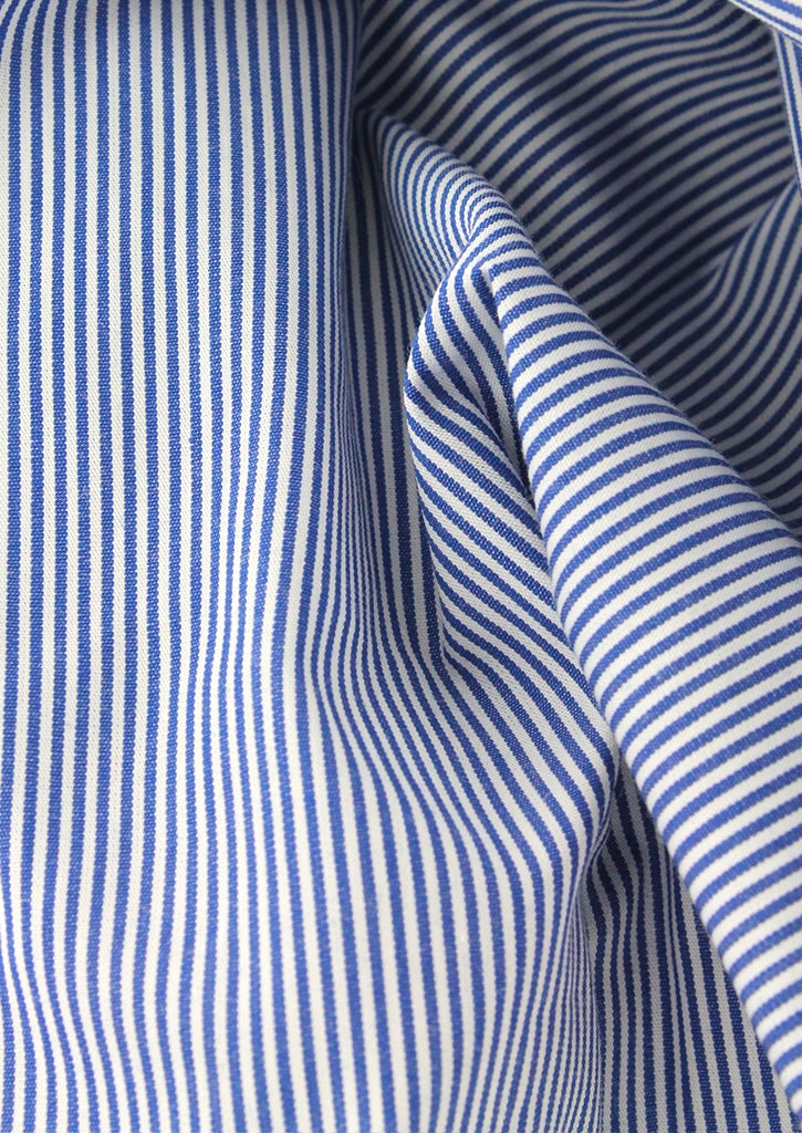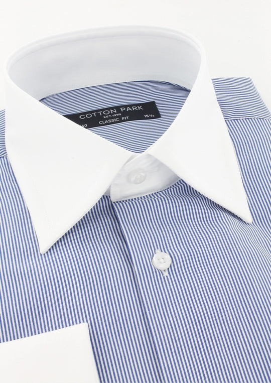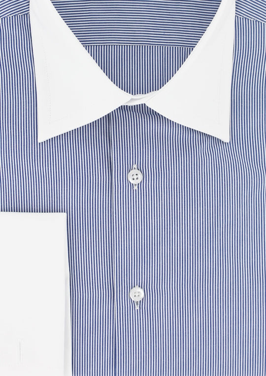 Chemise homme à manches longues, confectionnée dans un coton haut de gamme à fines rayures bleu marine, coupe droite. Son col classique blanc structuré, également appelé col français, est renforcé par des baleines collées et intégrées pour une tenue parfaite dans le temps.