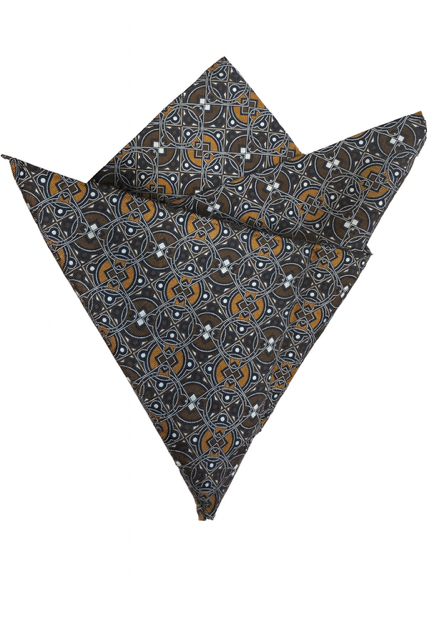 Pochette soie avec un camaieu de marron. Bord roulé cousu main. Pochette pour veste ou blazer. Nettoyage à sec. Fabriquée en Italie.