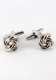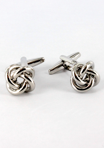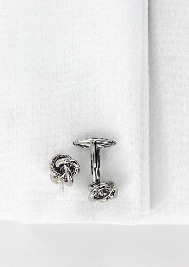 This box presents a pair of silver-coloured 4-knot cufflinks.
