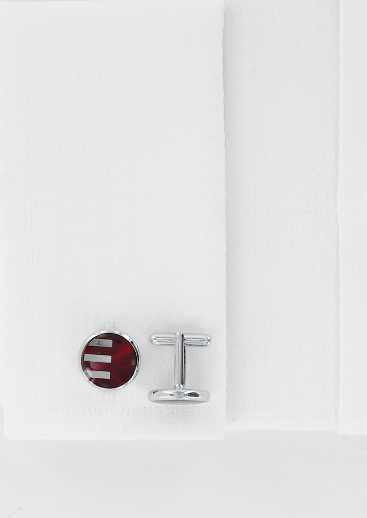 This box presents a pair of cufflinks in shape circular silver color with red stone effect.