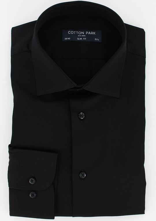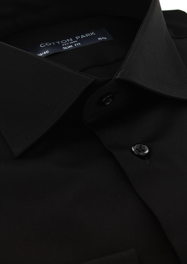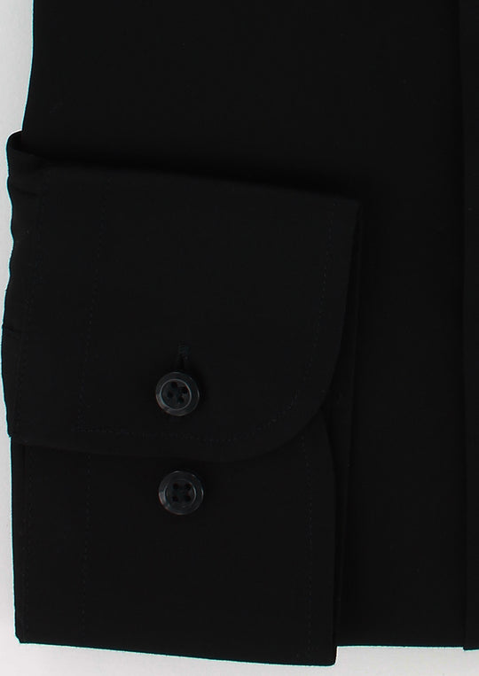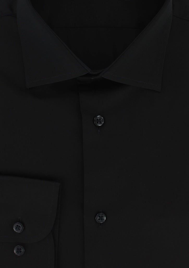 Men's fitted shirt in 100% black cotton . This long-sleeved shirt has a French collar and can be worn with or without a tie depending on the desired style.