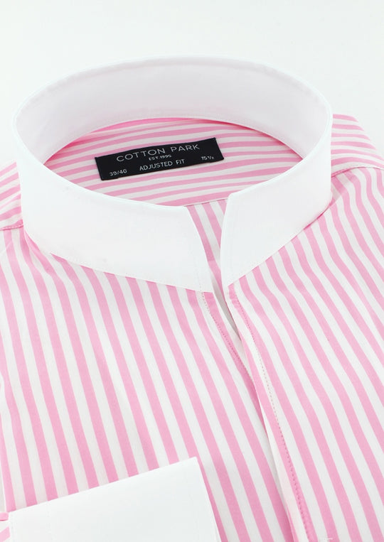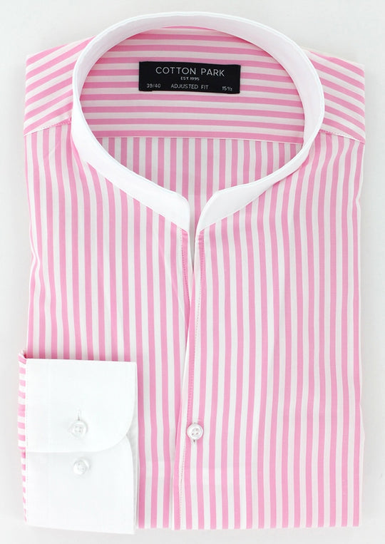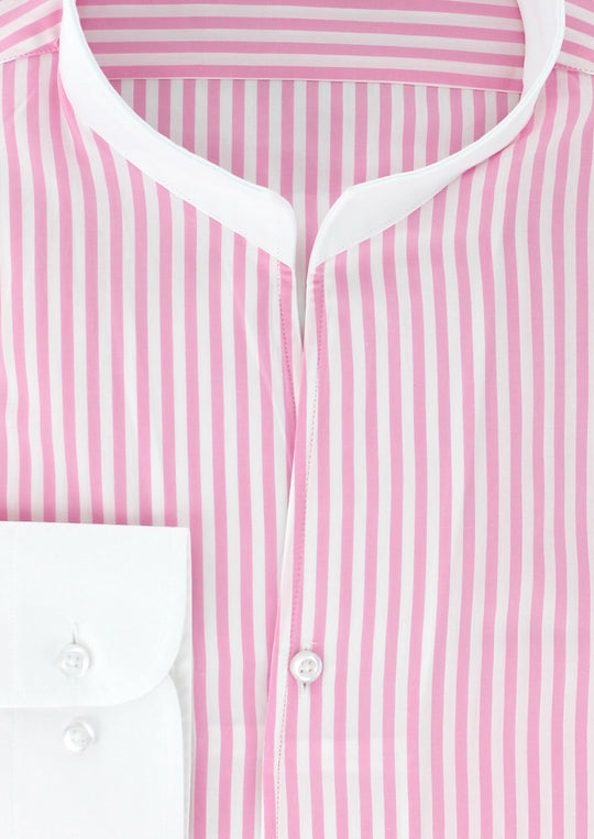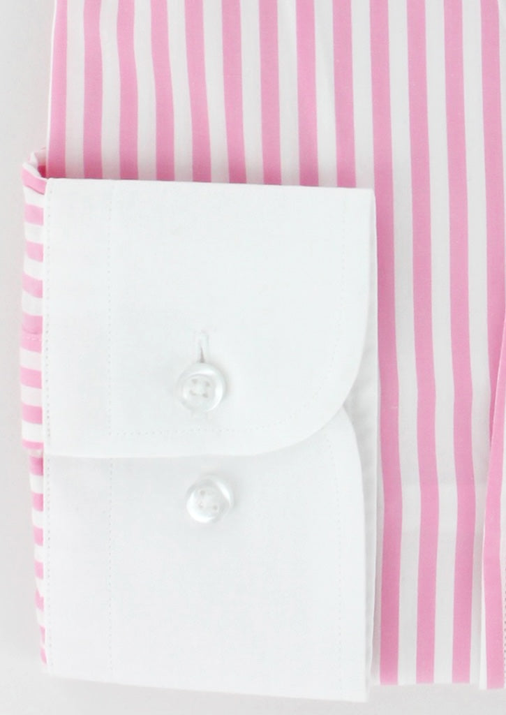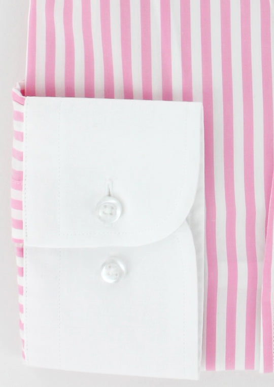 Chemise coupe ajustée pour homme à rayures roses fabriquée avec un col et des poignets blancs. Chemise possédant un indien. Ses manches longues avec poignets boutons réglables permettent de s'adapter avec précision à la largeur des poignets.