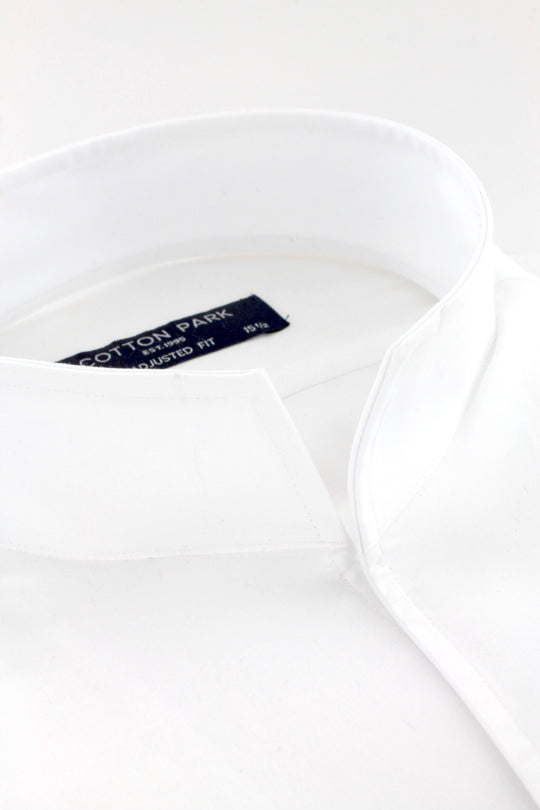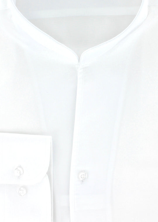 Chemise coupe ajustée pour homme fabriquée en satin de coton blanche possédant un col droit ouvert. Ses manches longues avec poignets boutons réglables permettent de s'adapter avec précision à la largeur des poignets.