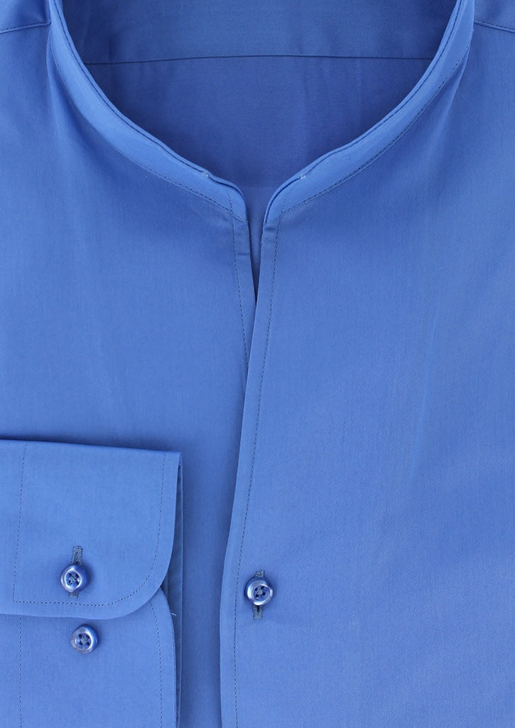 Chemise col indien coupe ajustée pour homme fabriquée avec un tissu en satin de coton bleu lavande. Ses manches longues avec poignets boutons réglables permettent de s'adapter avec précision à la largeur des poignets.