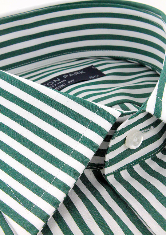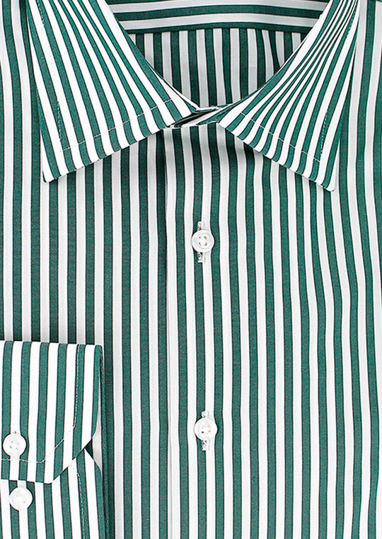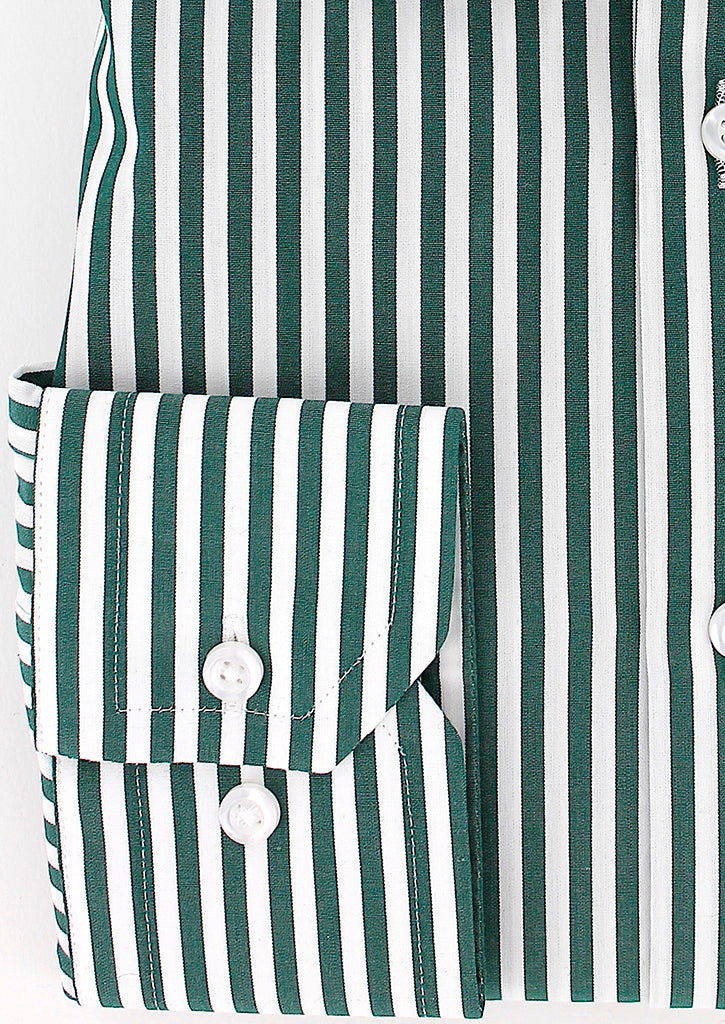 Chemise coupe droite pour homme à rayures bâton vertes manches longues. Son col classique ou col français est composé de baleines intégrées afin de conserver sa rigidité dans le temps. Il est possible d’ajuster avec précision ses poignets biseautés grâce à un système de double boutonnage. Cette chemise peut se porter avec ou sans cravate.