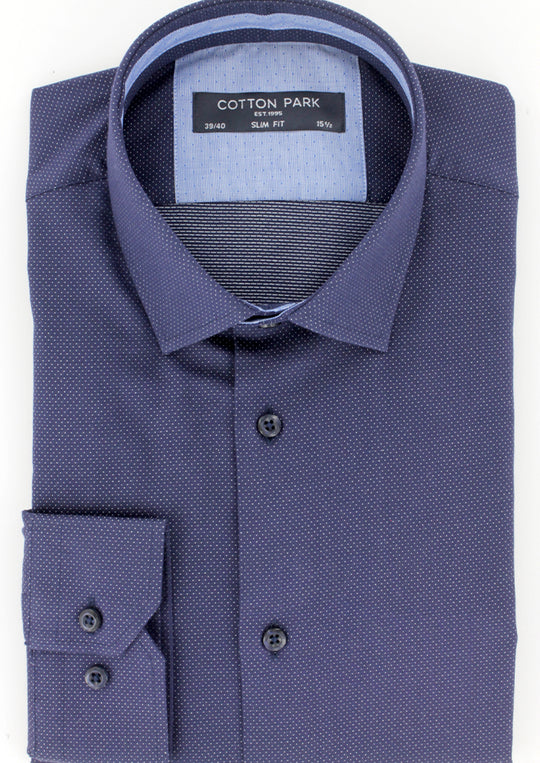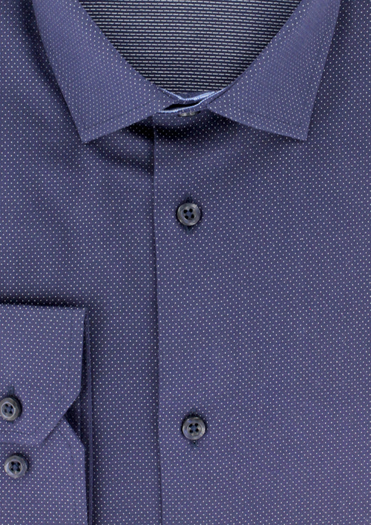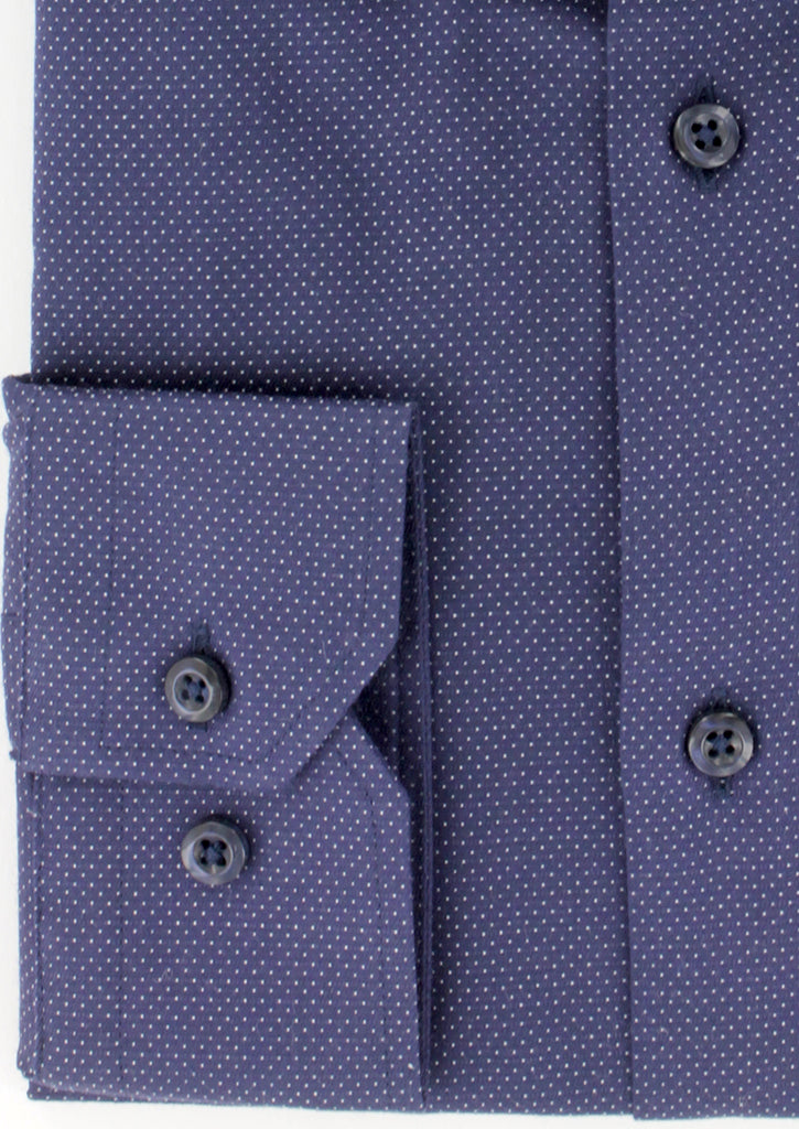 Chemise coupe cintrée pour homme fabriquée en 100% coton bleu marine à pois blancs. Son petit col est composé de baleines intégrées afin de conserver sa rigidité dans le temps. Ses manches longues avec poignets simples réglables permettent de s'adapter avec précision à la largeur des poignets. Chemise avec opposition bleu ciel au pied de col, gorge et poignets.