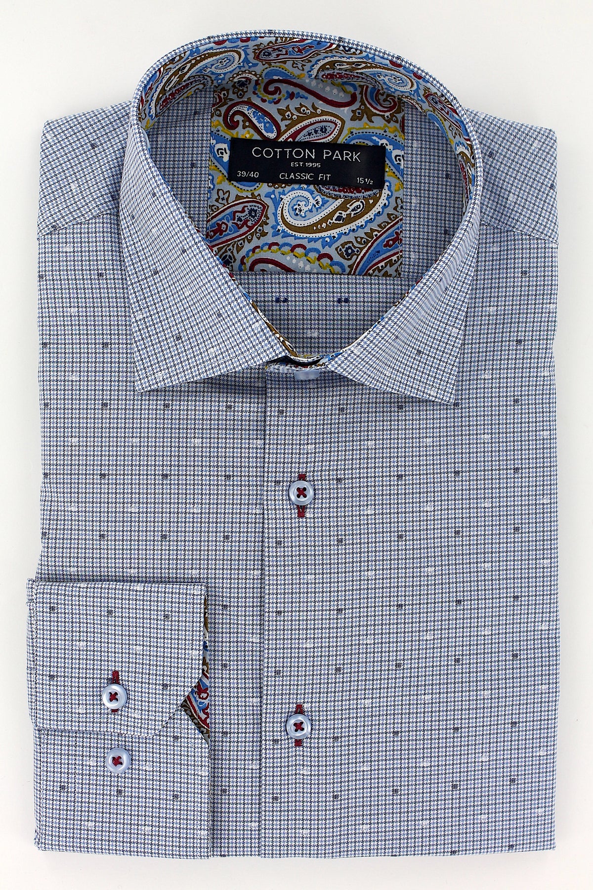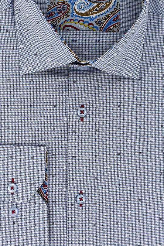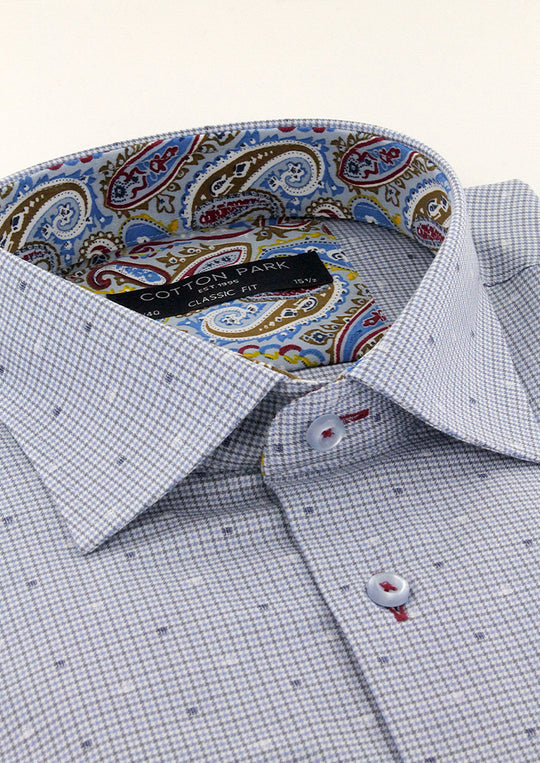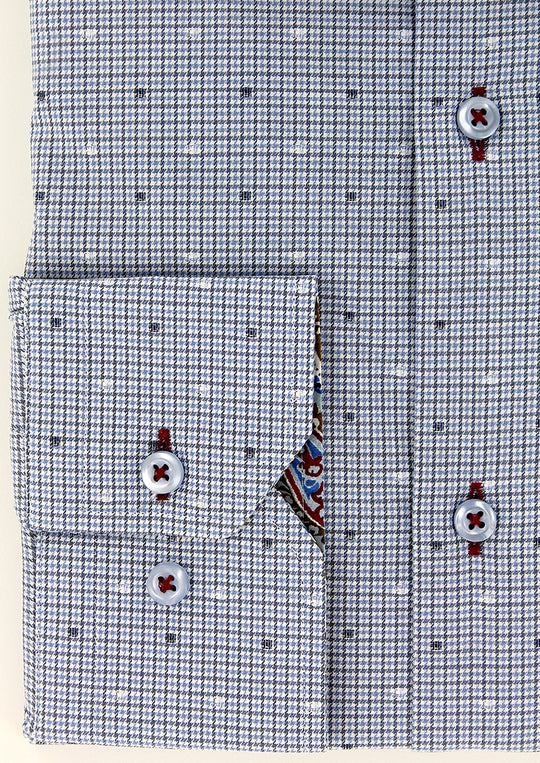 Chemise coupe droite pour homme en 100% coton à petits carreaux bleu gris. Cette chemise manches longues est doté d'un col français et peut se porter avec ou sans cravate selon le style désiré. Son col a été confectionné de sorte à conserver sa rigidité dans le temps grâce à des baleines collées et intégrées. Elle présente une opposition de couleurs au niveau du pied de col, la gorge et l'intérieur des poignets. Les deux boutons présents au poignet vous permettront d'ajuster la taille de celui-ci au vôtre.