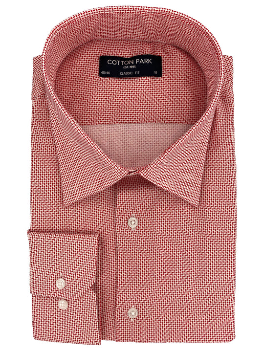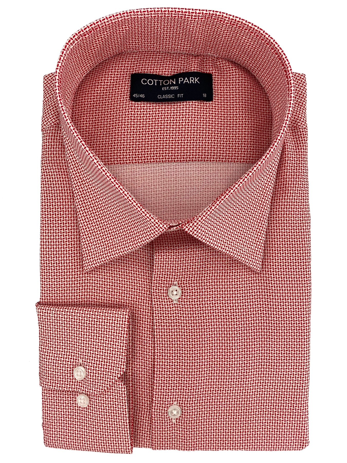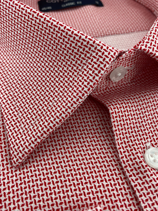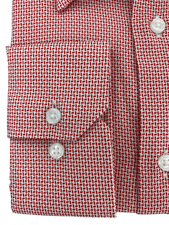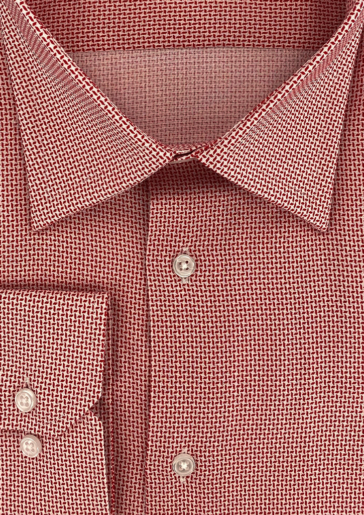 Chemise rouge coupe droite pour homme à motif tangram. Son col classique ou col français est composé de baleines intégrées afin de conserver sa rigidité dans le temps. Ses manches longues avec poignets boutons réglables permettent de s'adapter avec précision à la largeur des poignets. Cette chemise peut se porter avec ou sans cravate.