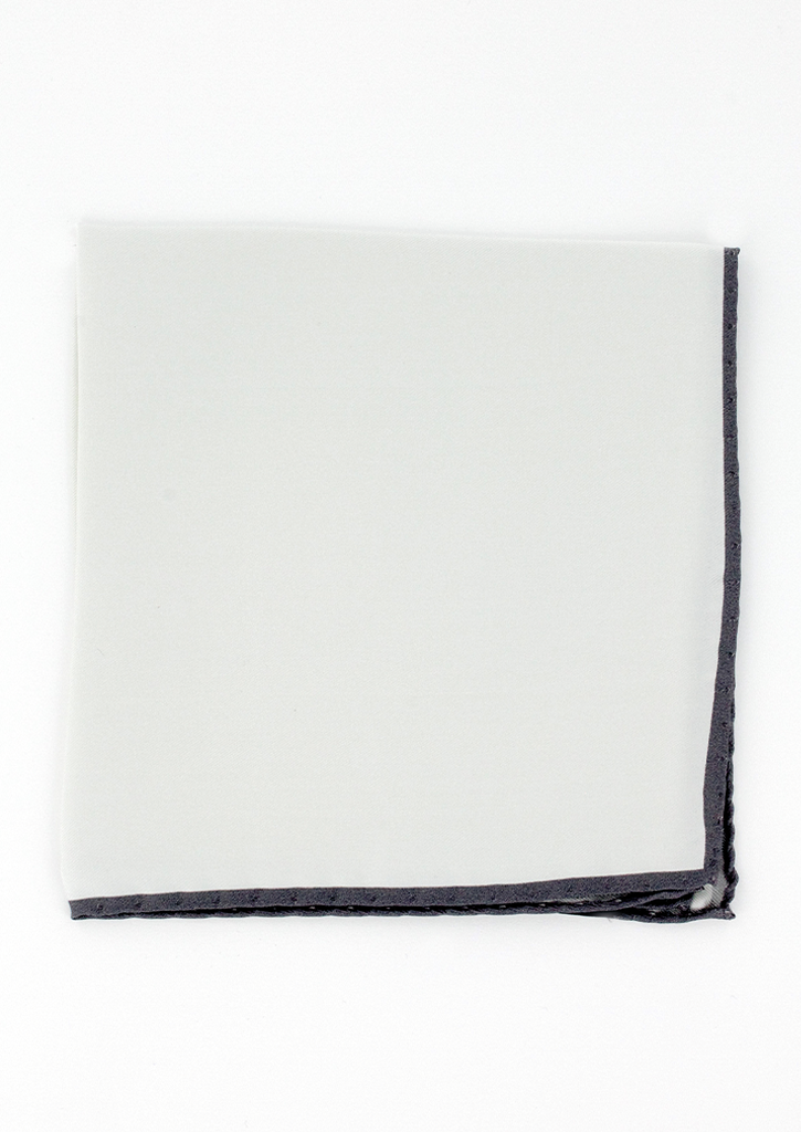 Pochette 100% soie de couleur blanc et à bordure grise. Bord roulé cousu main. Pochette pour veste ou blazer. Nettoyage à sec. Fabriquée en Italie.