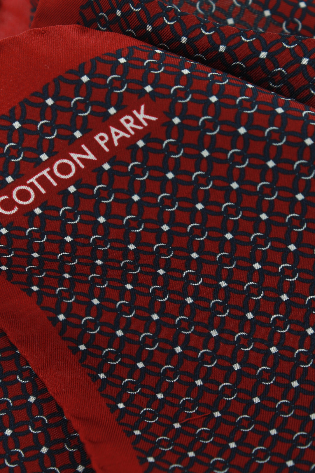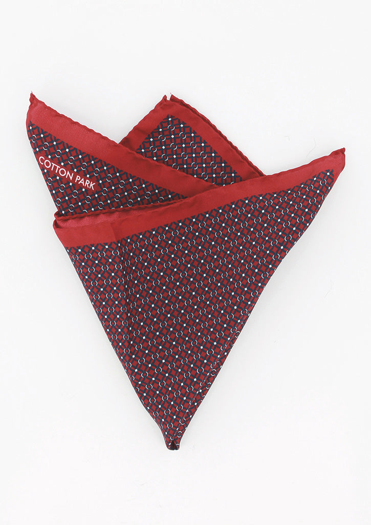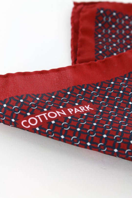 Pochette soie rouge à motifs cercle bleu marine. Bord roulé cousu main. Pochette pour veste ou blazer. Nettoyage à sec. Fabriquée en Italie.