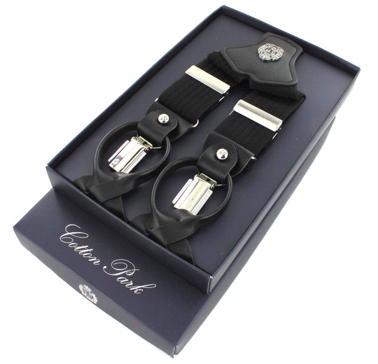 Élaborées avec soin, ces bretelles noires à rayures ton sur ton incarnent l’alliance parfaite entre sobriété élégante et fonctionnalité.