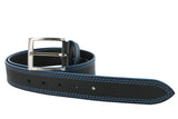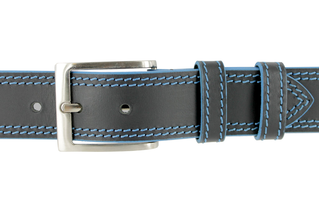 Ceinture en cuir noir avec surpiqûre bleu ciel. Boucle ardillon métal double passant en cuir.