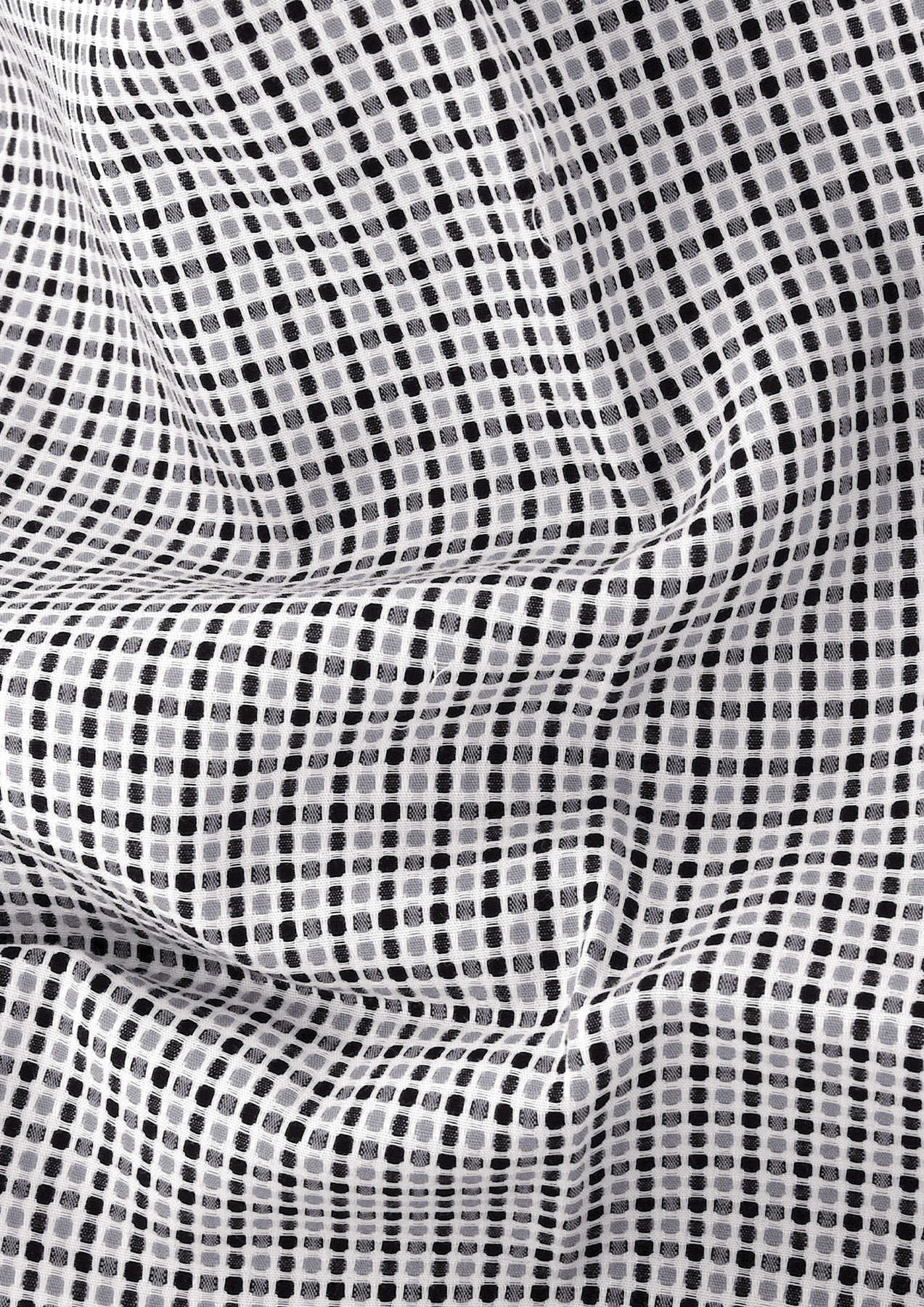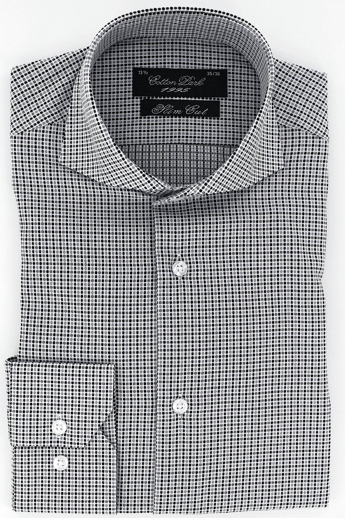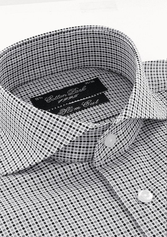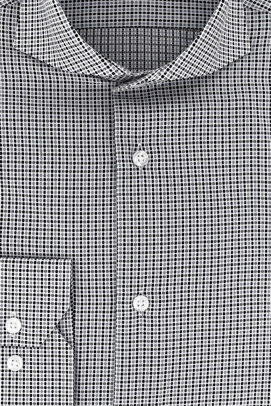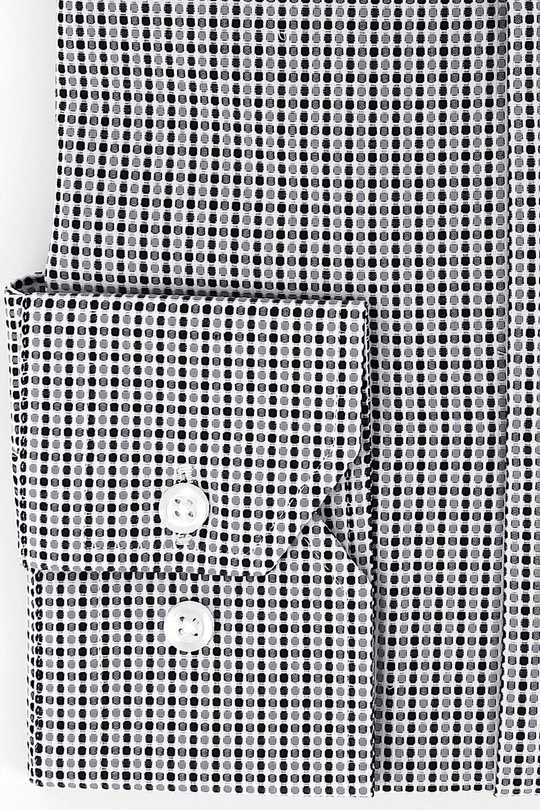 Chemise coupe cintrée pour homme fabriquée en 100% coton de couleur blanc à motifs noirs et gris. Son col cutaway est composé de baleines intégrées afin de conserver sa rigidité dans le temps.
