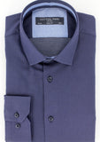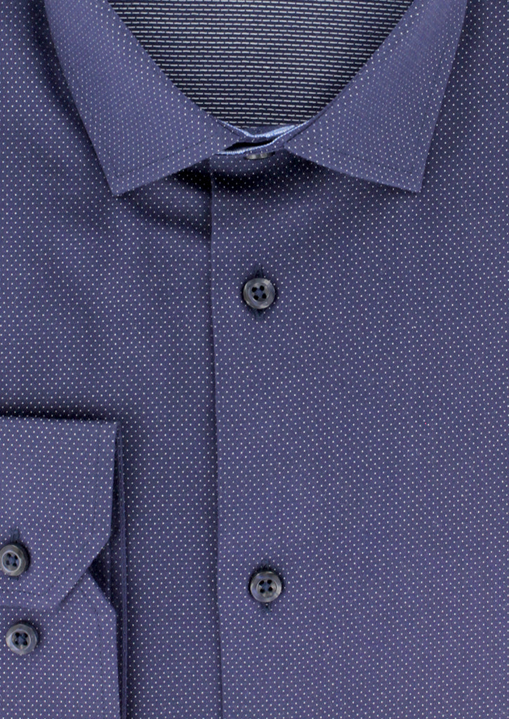 Chemise coupe cintrée pour homme fabriquée en 100% coton bleu marine à pois blancs. Son petit col est composé de baleines intégrées afin de conserver sa rigidité dans le temps. Ses manches longues avec poignets simples réglables permettent de s'adapter avec précision à la largeur des poignets. Chemise avec opposition bleu ciel au pied de col, gorge et poignets.