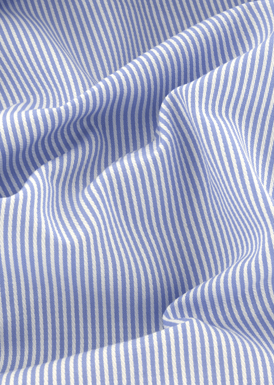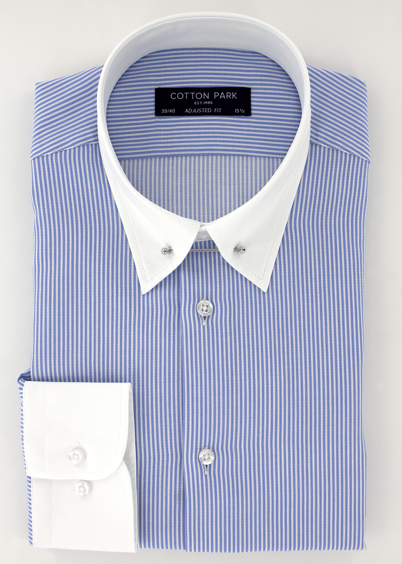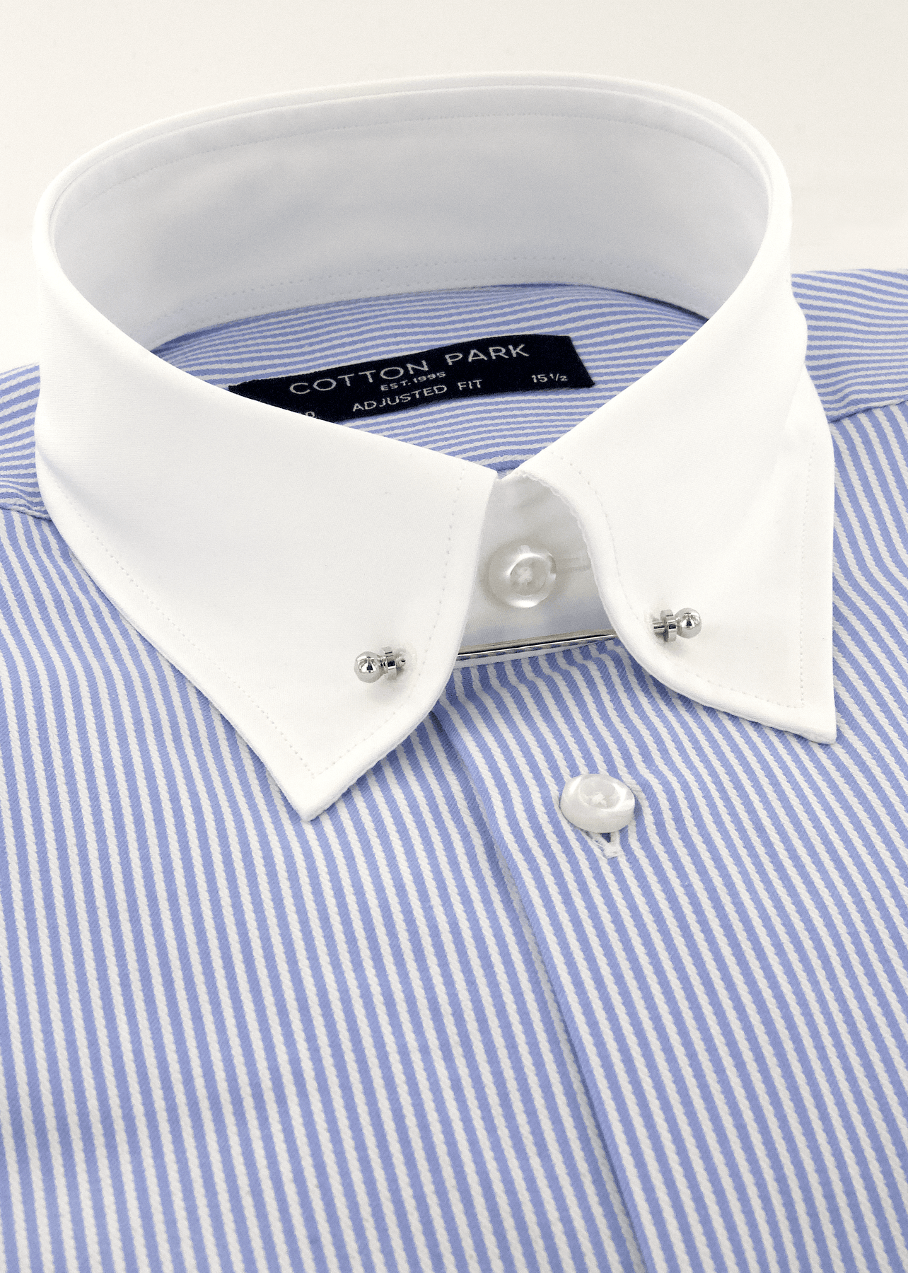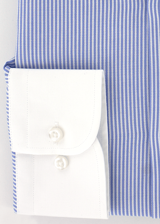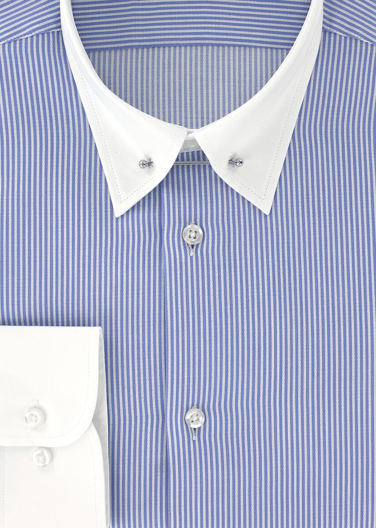 Chemise coupe ajustée pour homme à fines rayures bleu ciel fabriquée avec un col anglais à barrette de couleur argent. Ses manches longues avec poignets boutons réglables permettent de s'adapter avec précision à la largeur des poignets. Le col anglais permet de conserver la bonne tenue de la cravate tout au long de la journée.