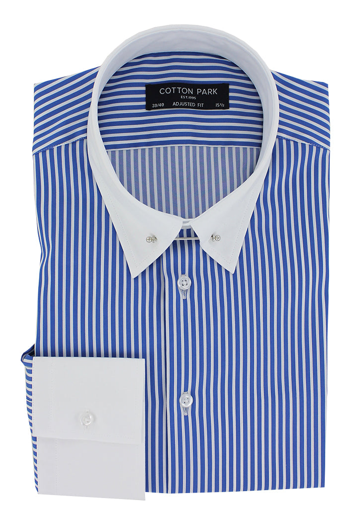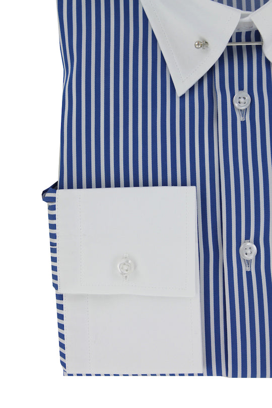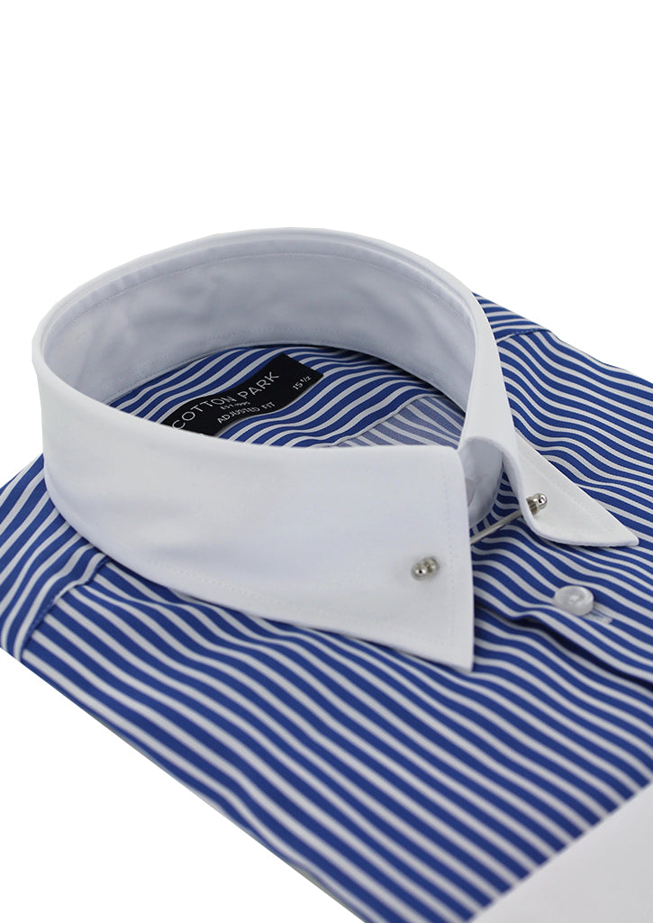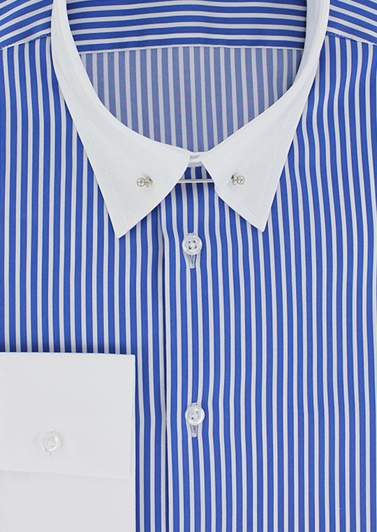 Chemise coupe cintrée pour homme à rayures bâton bleues possédant un col anglais à barrette de couleur argent.