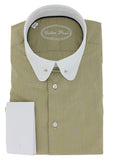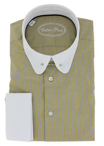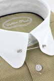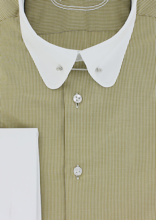 Chemise double retors coupe droite pour homme à motifs vichy jaune moutarde possédant un col anglais arrondi à barrette de couleur argent. Cette chemise pour homme haut de gamme à été conçue en manches longues avec poignets mousquetaires afin de porter des boutons de manchette qui la mettront en valeur en vous donnant la possibilité de personnaliser votre look. Le col anglais conservera la bonne tenue de votre cravate tout au long de la journée.