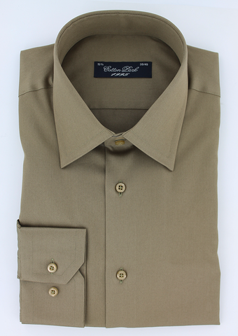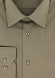 Chemise coupe droite pour homme en 100% satin de coton de couleur brun olive. Cette chemise manches longues est doté d'un col ville et peut se porter avec ou sans cravate selon le style désiré.
