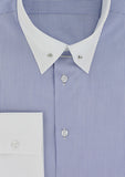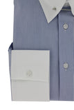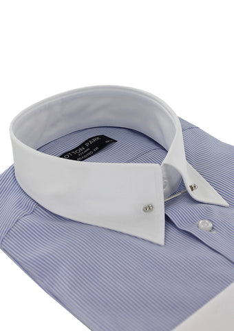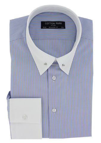 Chemise coupe cintrée pour homme à rayures bleues possédant un col anglais à barrette de couleur argent. En un coup de main, il est possible de rendre ce poignet simple en poignet mousquetaire et ainsi porter une jolie paire de bouton de manchette Cotton Park.Le col anglais conservera la bonne tenue de votre cravate tout au long de la journée.