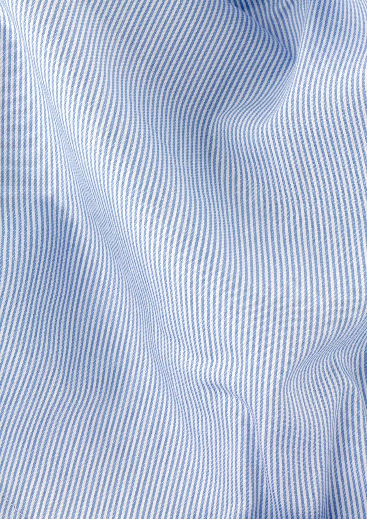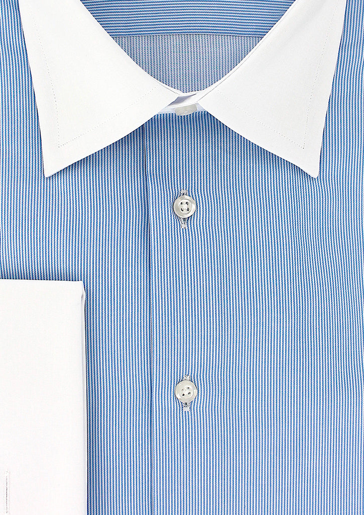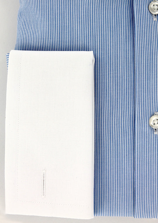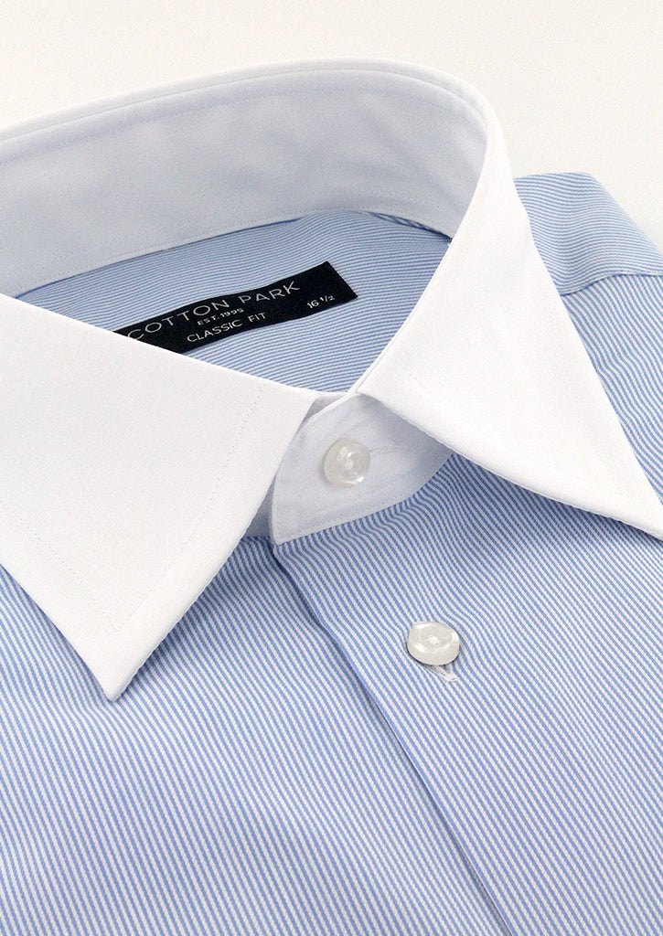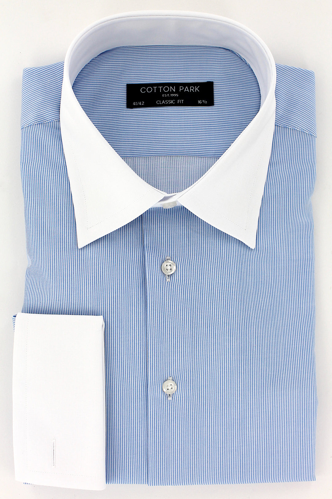 Alliant élégance et sobriété, cette chemise pour homme à coupe droite présente un motif à fines rayures bleu ciel, sublimé par un col blanc classique ou français et des poignets mousquetaires blancs parfaitement assortis. Sans poche, elle offre une ligne épurée, idéale pour être portée avec une cravate Cotton Park.