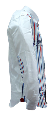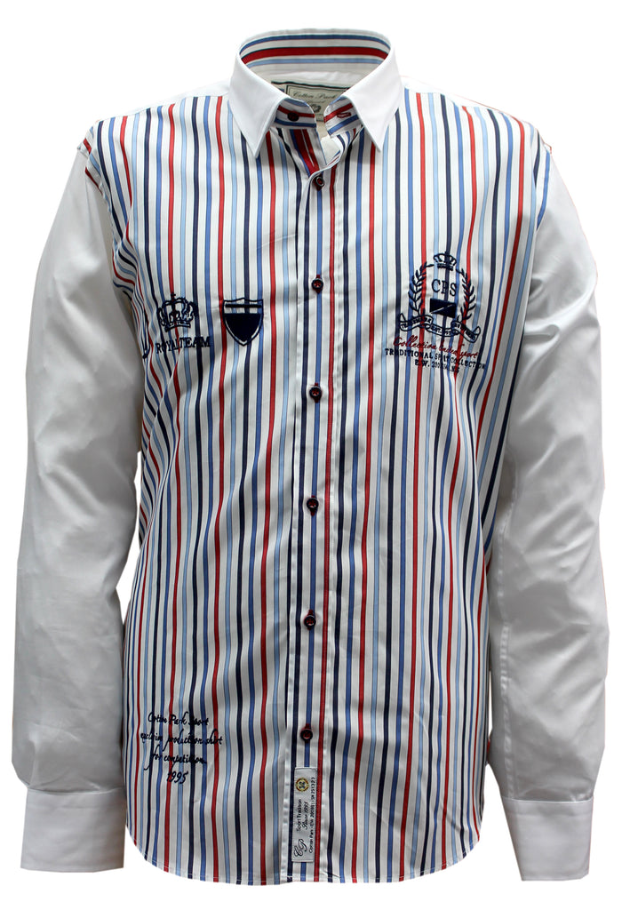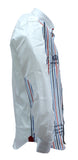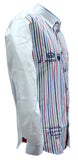 Cette chemise est le résultat d'un assemblage parfait d'un motif à rayures bleu et rouge au torse et d'une couleur unie blanc aux épaules. Les deux boutons présents au poignet vous permettront d'ajuster la taille de celui-ci au vôtre.