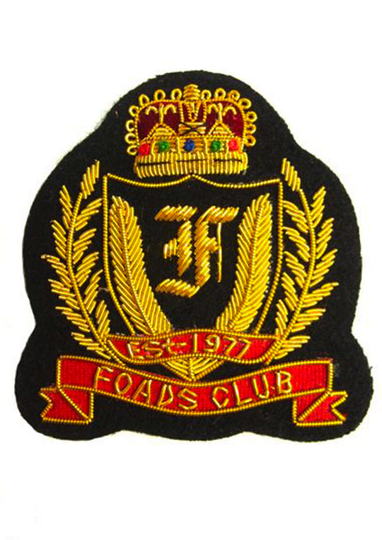 Écusson pour blazer doré, noir et rouge, brodé main à coudre. Couronne qui se situe au dessus des 2 épis et signé en bas d'une bannière rouge FOADS CLUB