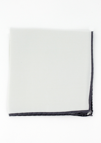 Pochette 100% soie de couleur blanc et à bordure grise. Bord roulé cousu main. Pochette pour veste ou blazer. Nettoyage à sec. Fabriquée en Italie.