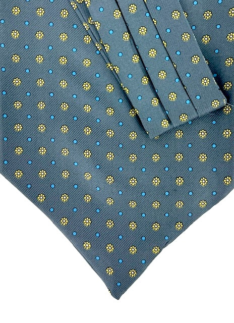 Ascot homme 100 % soie de couleur grise à motifs jaune. Cet ascot de la marque Cotton Park est d'une largeur de 16 cm et d'une longueur de 136 cm.