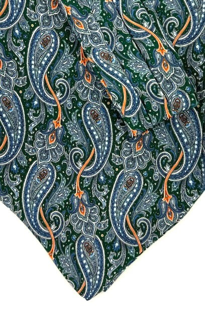 Ascot homme 100 % soie de couleur vert à motifs paisley. Cet ascot de la marque Cotton Park est d'une largeur de 16 cm et d'une longueur de 136 cm.