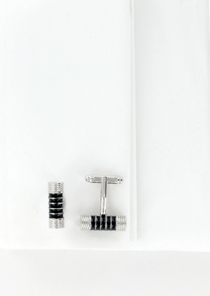 Boutons de manchettes cylindriques couleur argent à motif noir