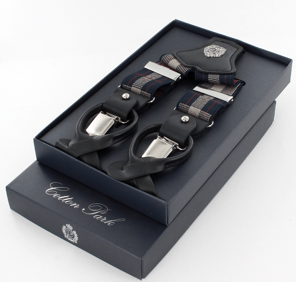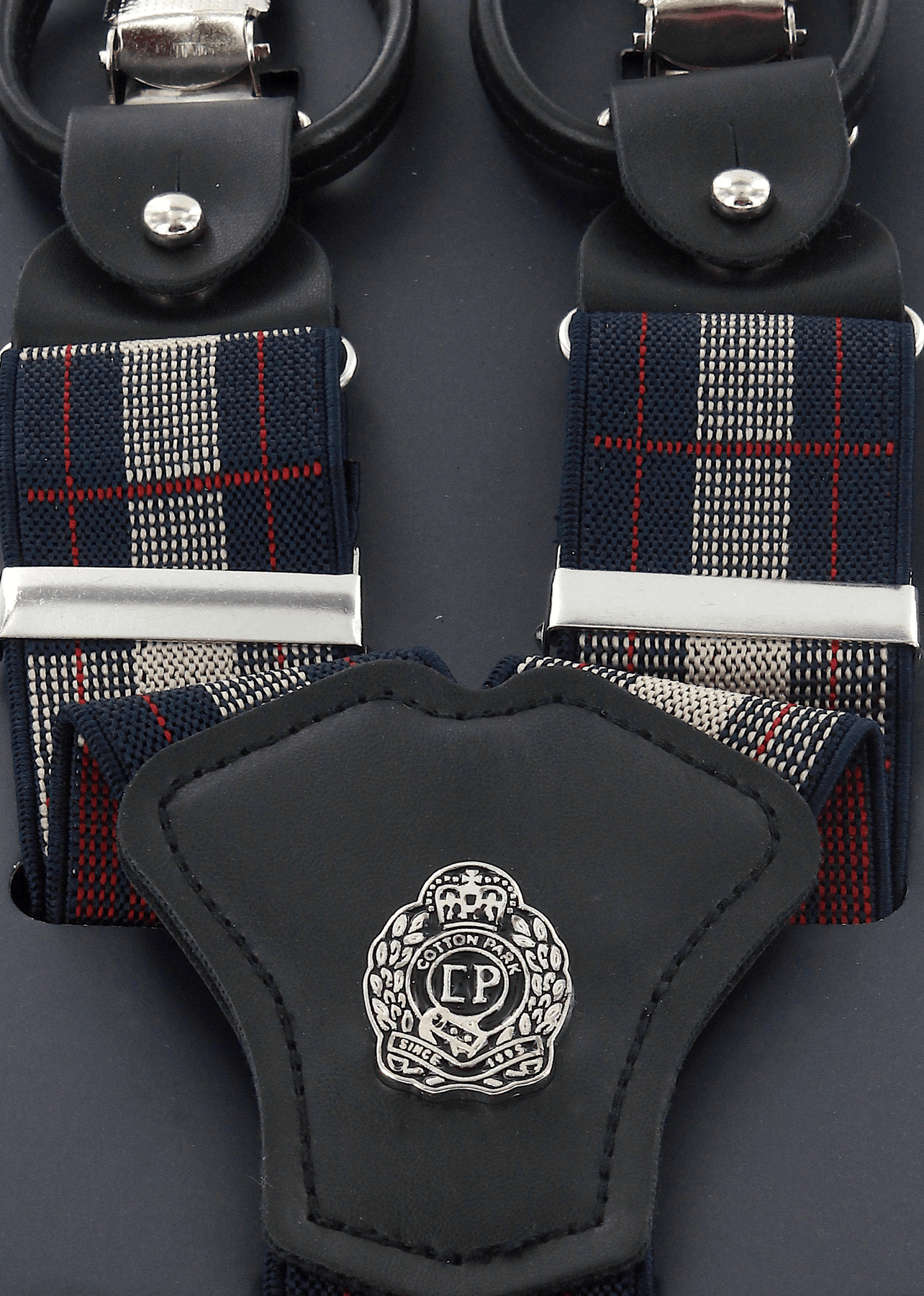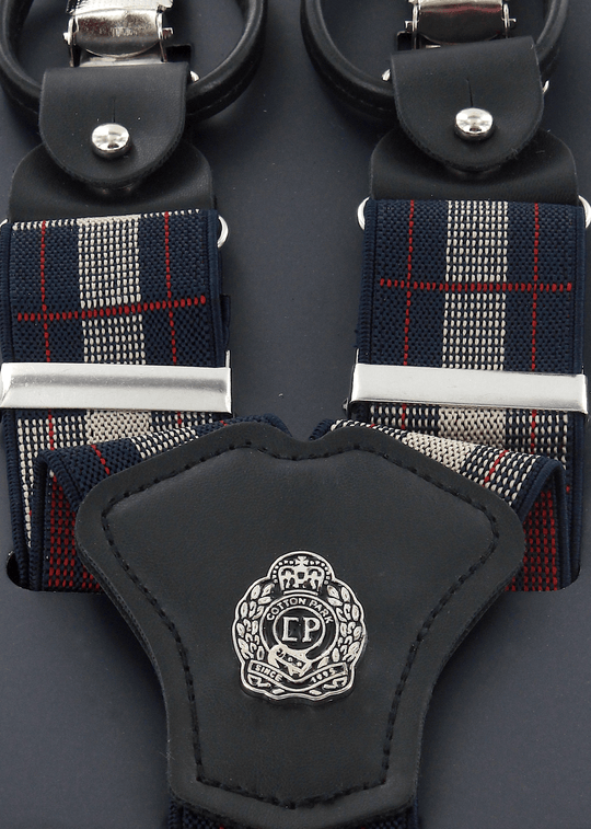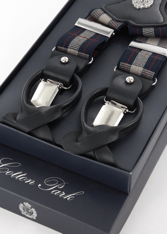 Exprimez votre style avec ces bretelles bleu marine à motif clan écossais beige signées Cotton Park, parfaites pour une allure à la fois traditionnelle et tendance.