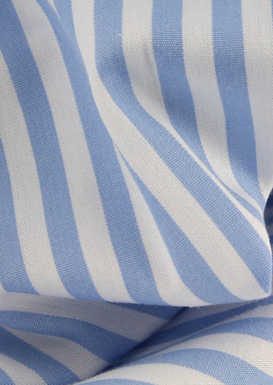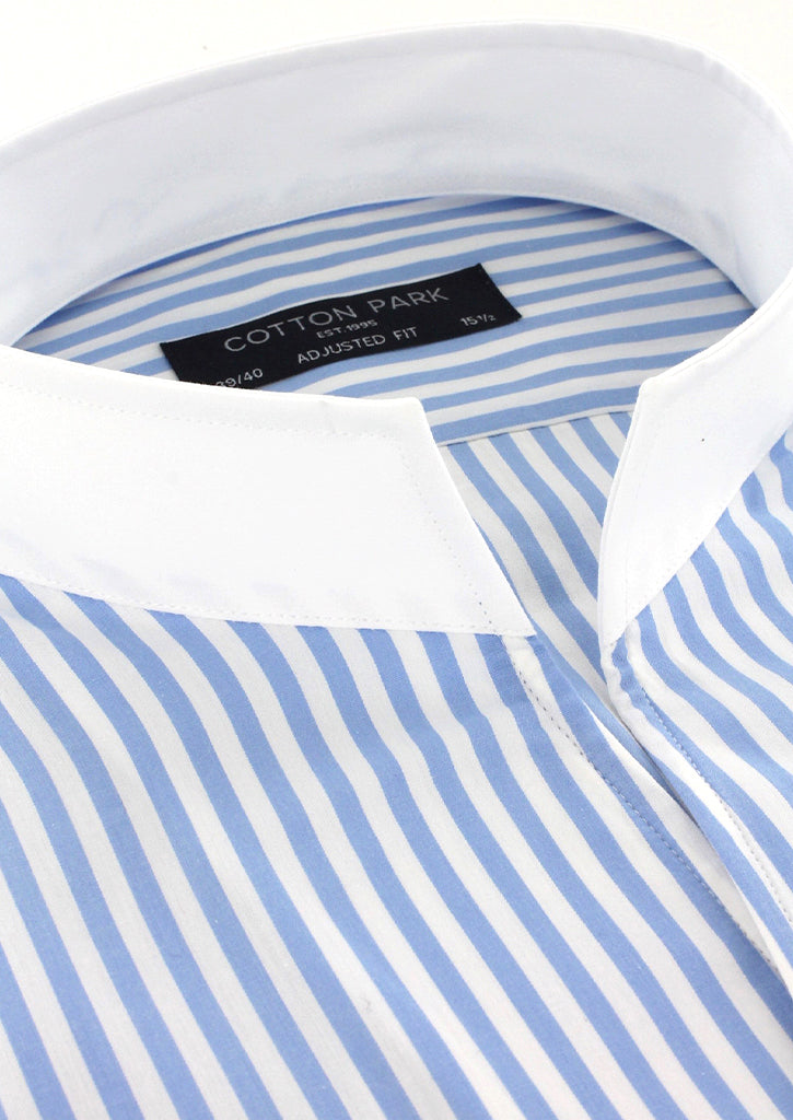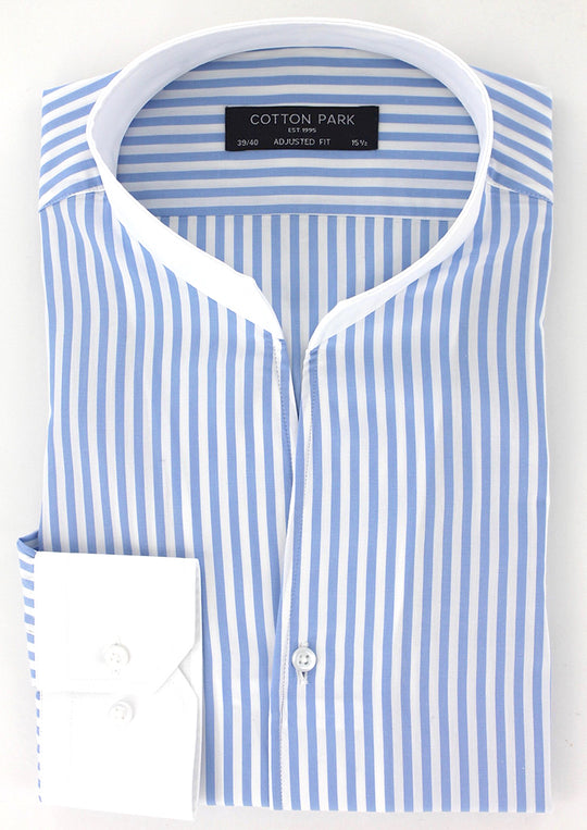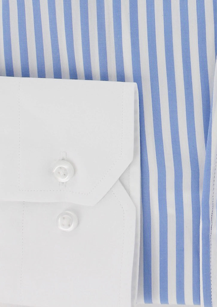 Chemise coupe ajustée pour homme à rayures bleu ciel fabriquée avec col indien et poignets blancs. Ses manches longues avec poignets boutons réglables permettent de s'adapter avec précision à la largeur des poignets.