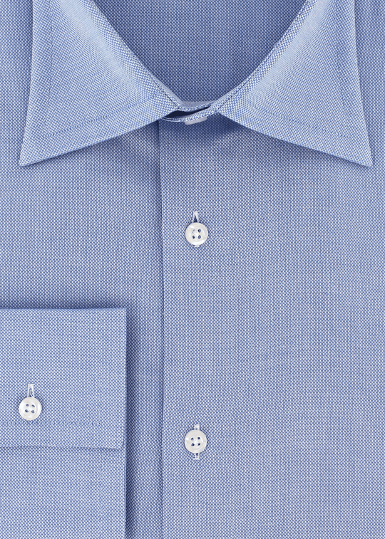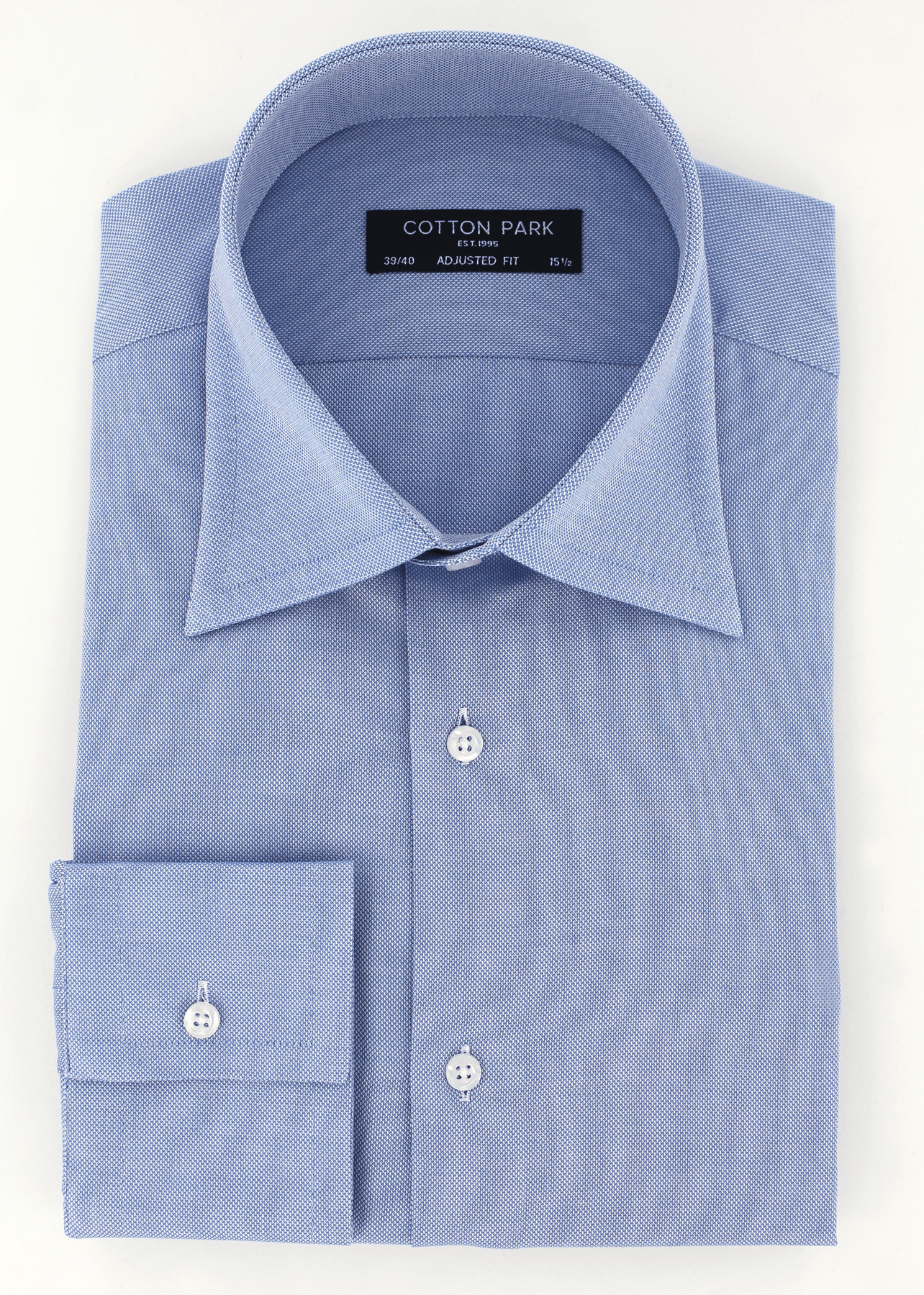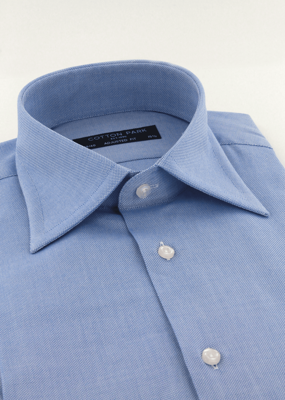 Chemise coupe cintrée pour homme fabriquée en natté de coton bleu. Son col classique ou col Français est composé de baleines intégrées. En un coup de main, il est possible de rendre ce poignet simple en poignet mousquetaire et porter une jolie paire de bouton de manchette Cotton Park. Cette chemise peut se porter aussi bien avec une cravate que sans.
