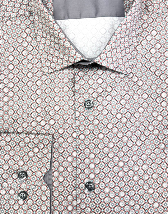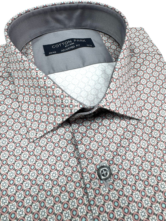Cette chemise en 100% coton vous est proposée en coupe cintrée avec des imprimés beige et gris. La chemise est proposée avec un petit col italien avec opposition unie de couleur grise. Chemise avec baleines intégrées.