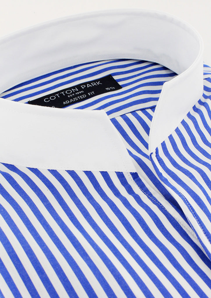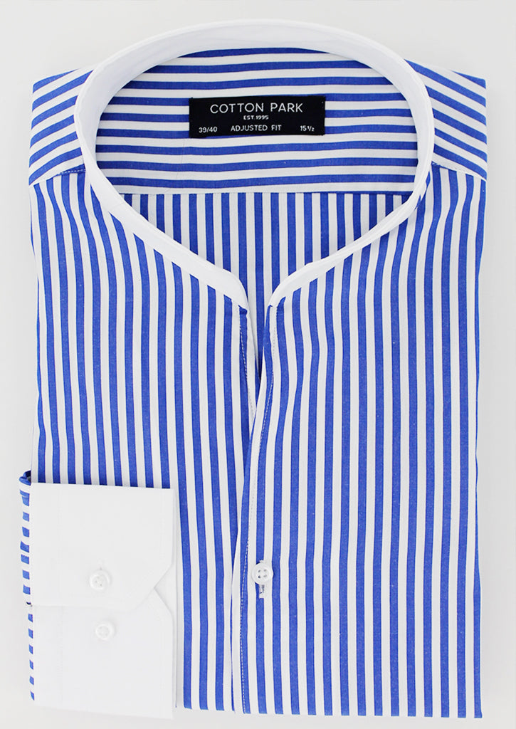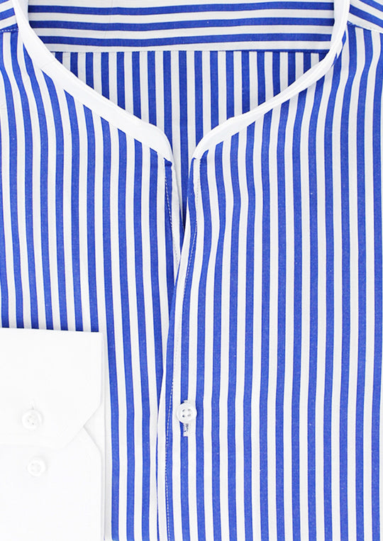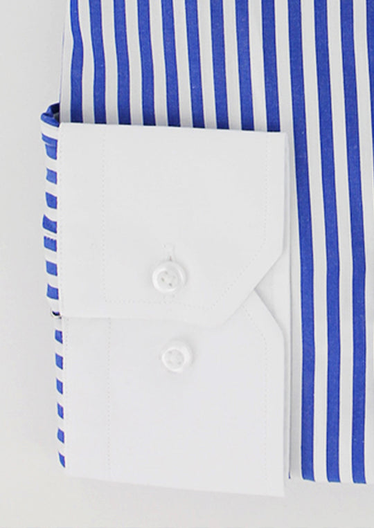 Chemise coupe ajustée pour homme à rayures bleu royal fabriquée avec un col indien et poignets blancs. Ses manches longues avec poignets boutons réglables permettent de s'adapter avec précision à la largeur des poignets.