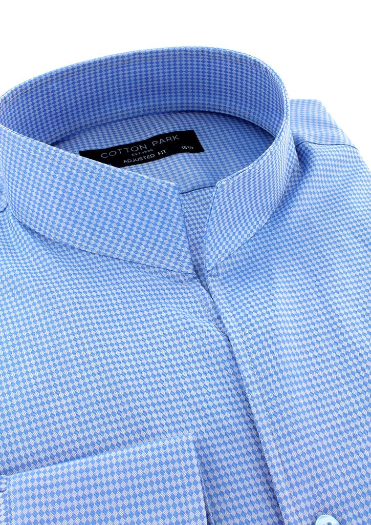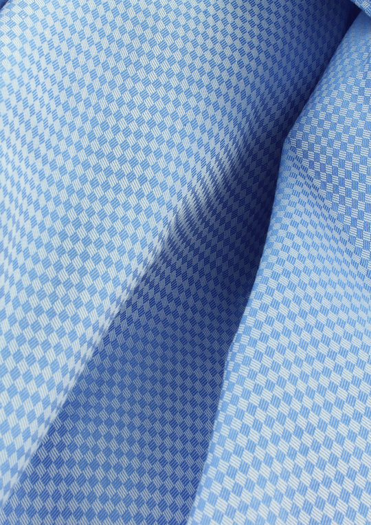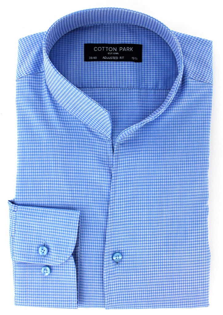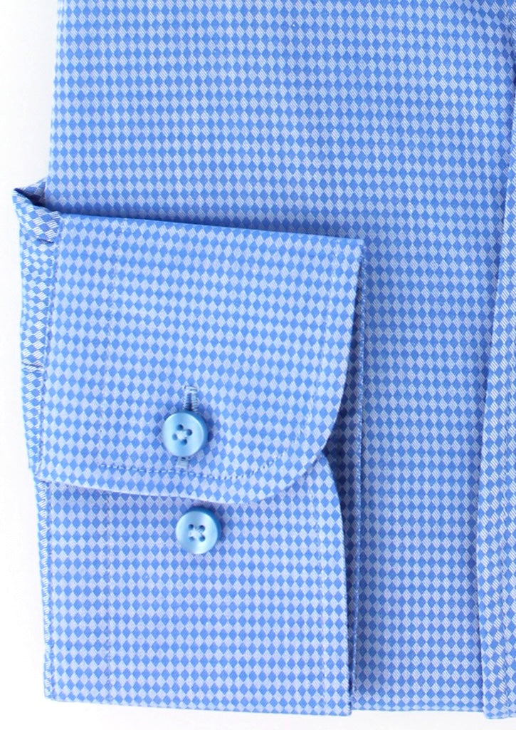 Affichez un style moderne et raffiné avec cette chemise pour homme à col indien, confectionnée dans un coton doux et respirant au motif géométrique bleu ciel sur fond bleu moyen. Sa coupe ajustée met en valeur la silhouette tout en offrant un excellent confort au quotidien.
