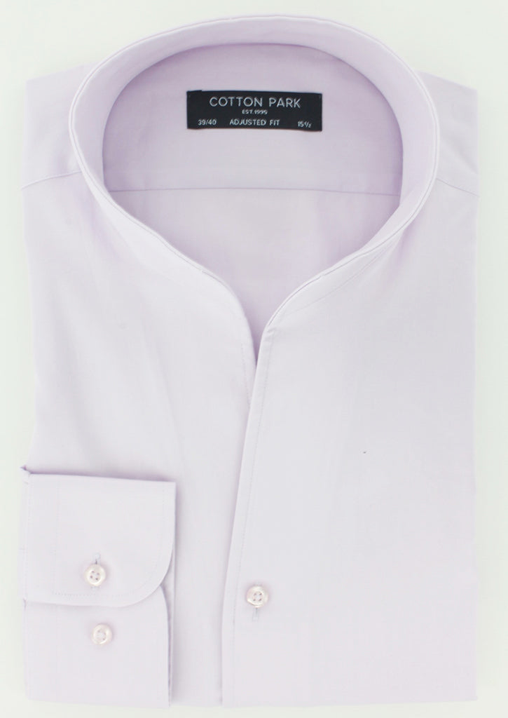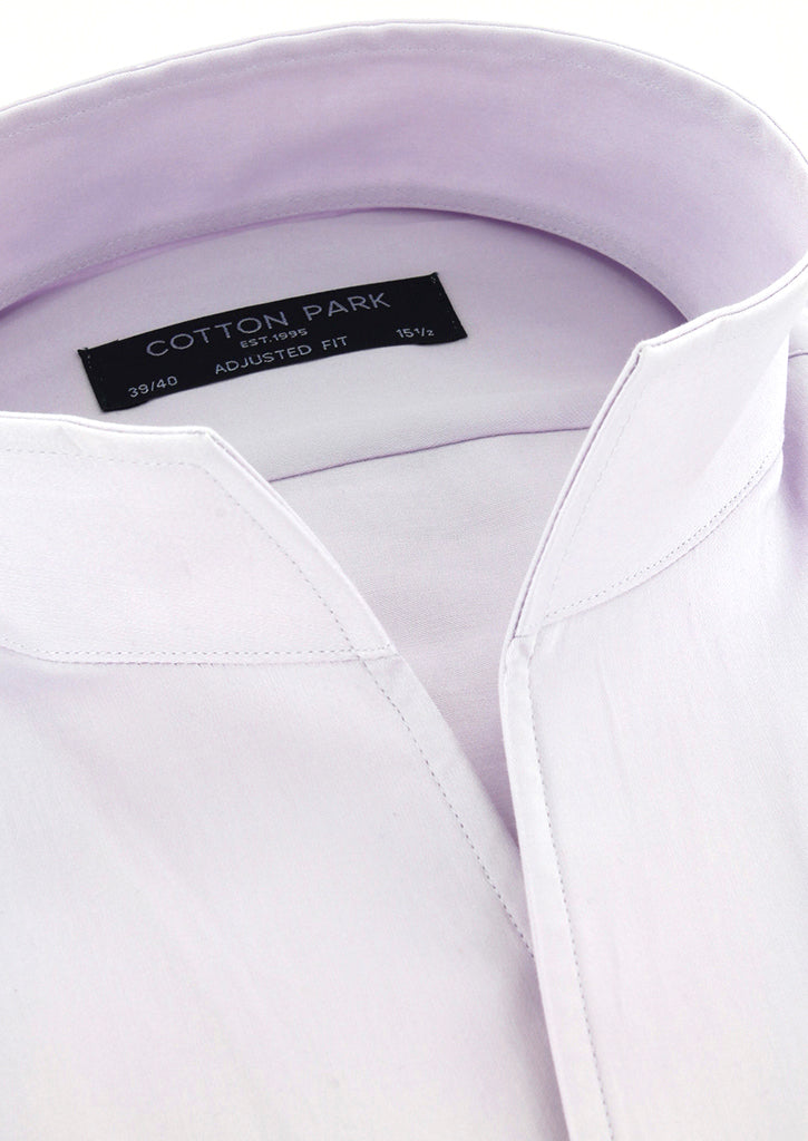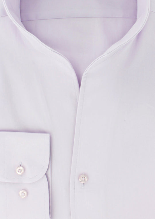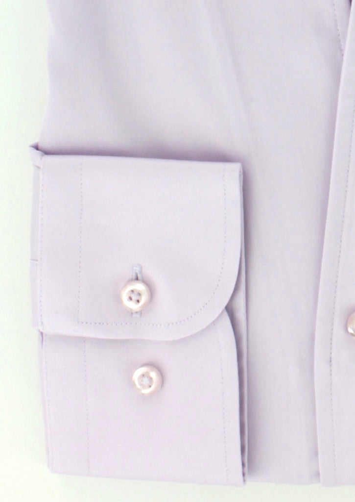 Chemise coupe ajustée pour homme fabriquée en satin de coton parme possédant un col droit ouvert. Ses manches longues avec poignets boutons réglables permettent de s'adapter avec précision à la largeur des poignets.