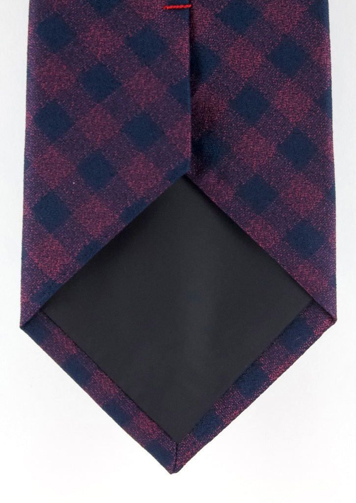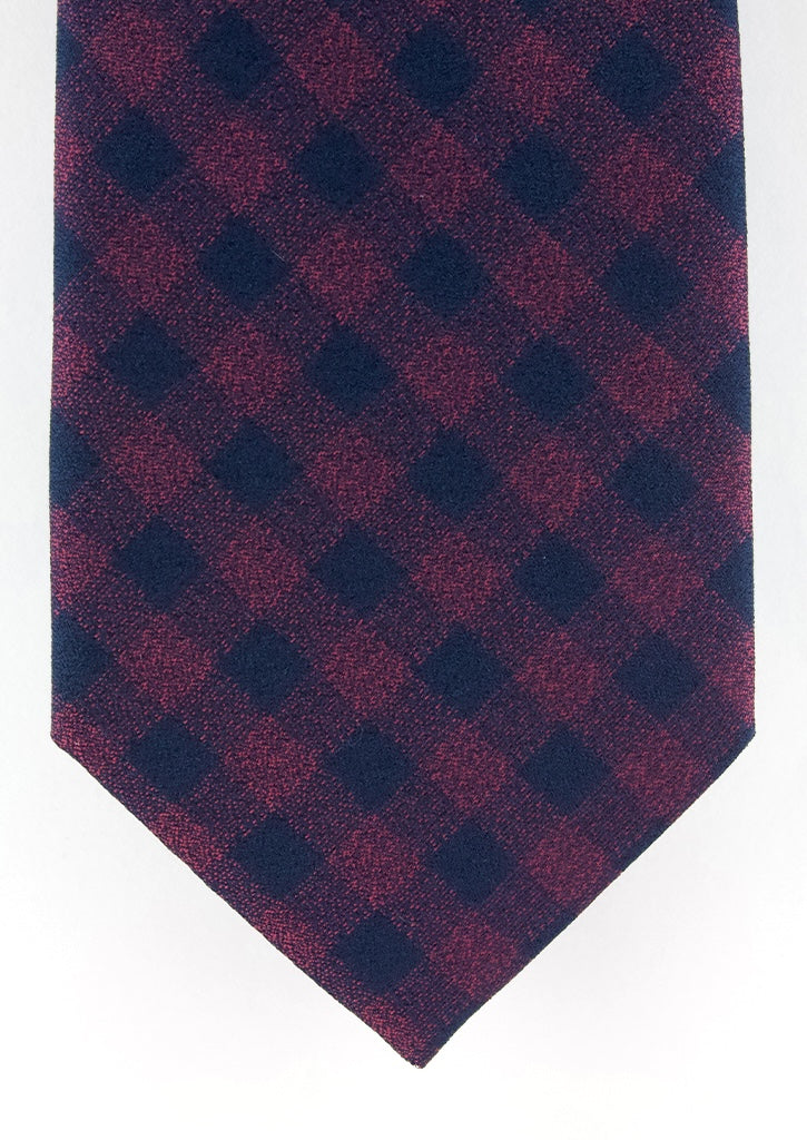 Cravate en soie tissée bordeaux motif carré bleu marine