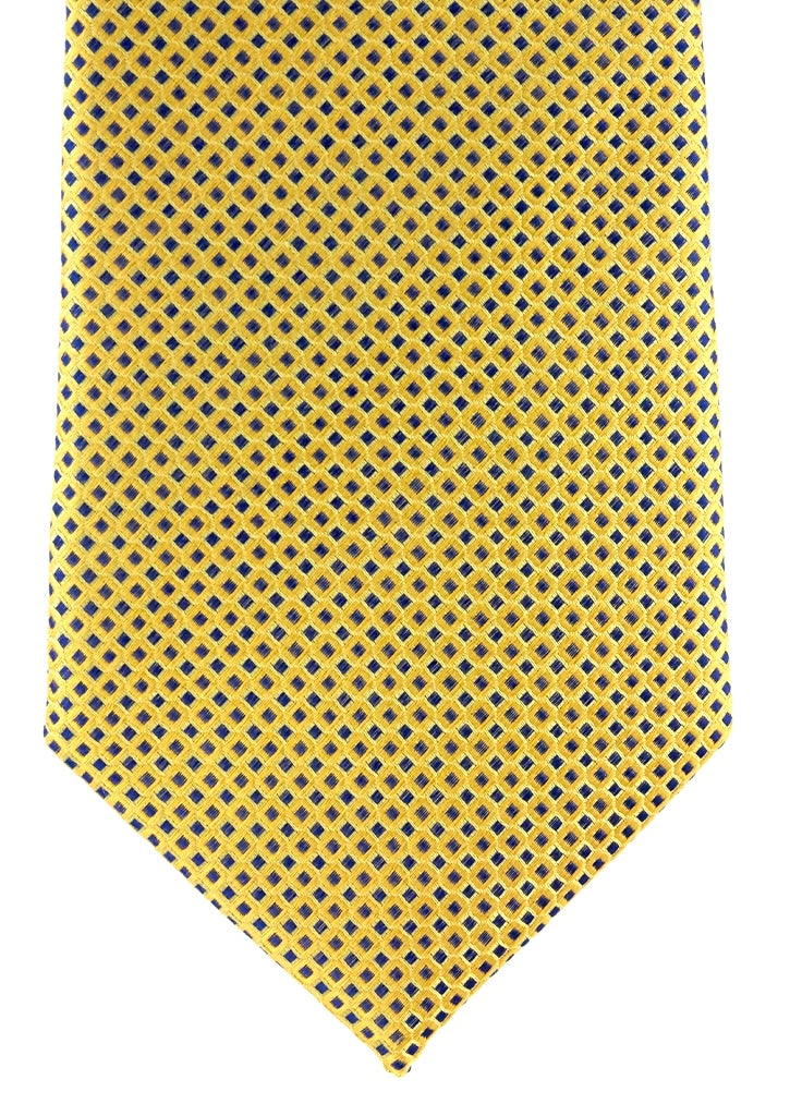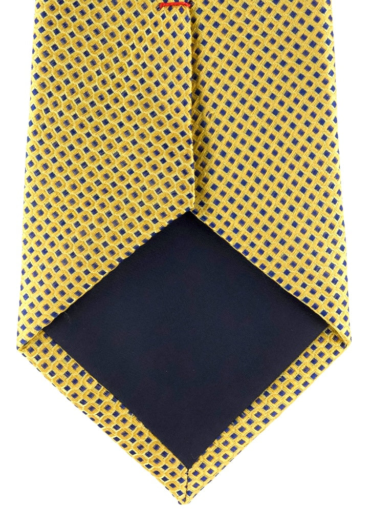 Cravate en soie tissée jaune motifs ronds bleu marine